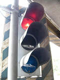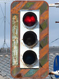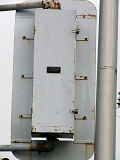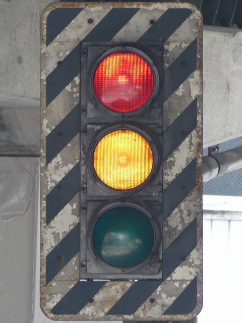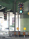 高架下の縦型補助灯器です。背景が明るいので、灯器を目立たせるために背面板が設置されているようです。
