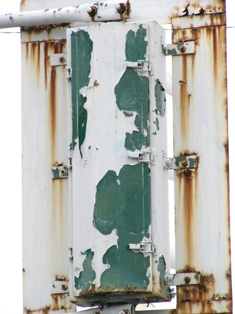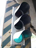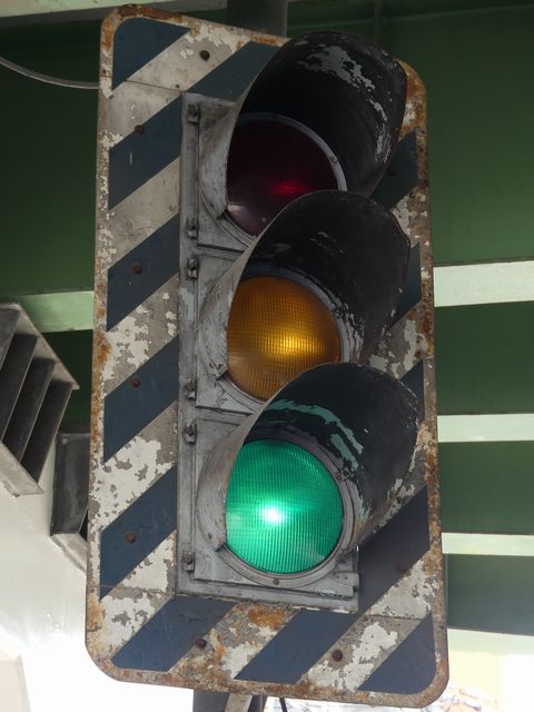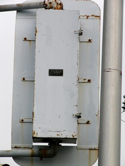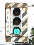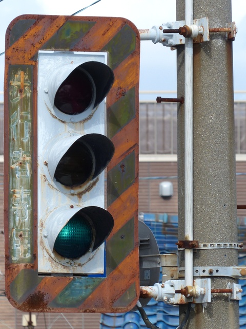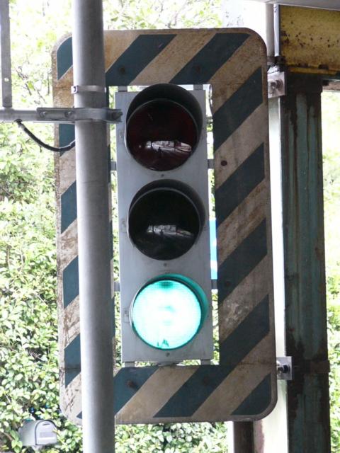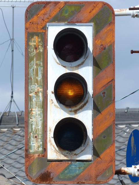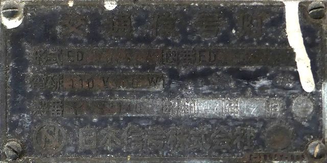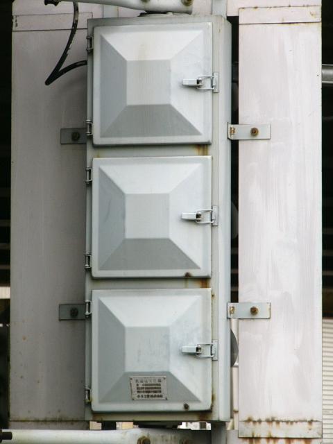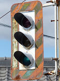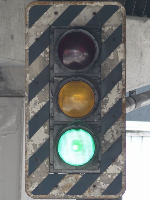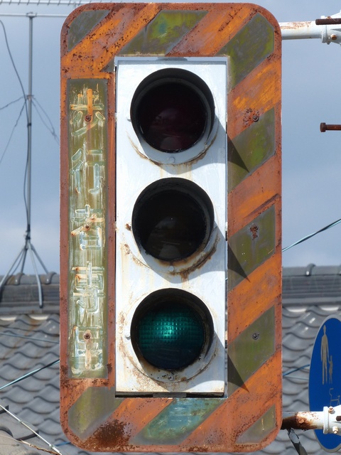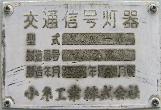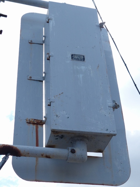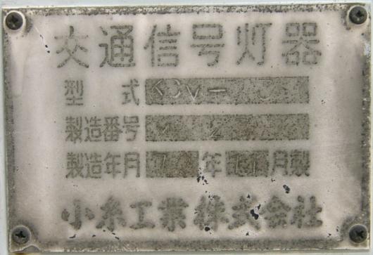 高架下のロータリー型交差点で主灯器として設置されていた300φ縦型灯器(表蓋)です。灯器は高架下の設置で暗く、背景が明るいので、灯器を目立たせるために背面板が設置されていました。