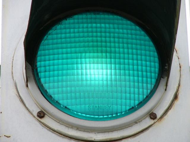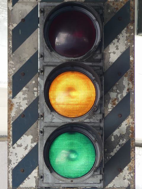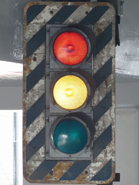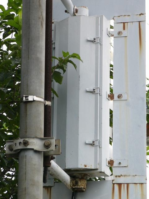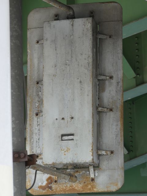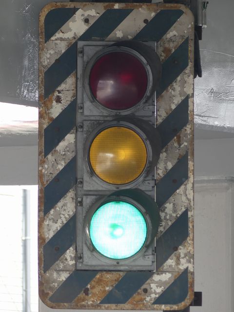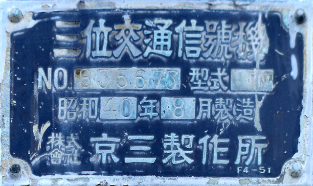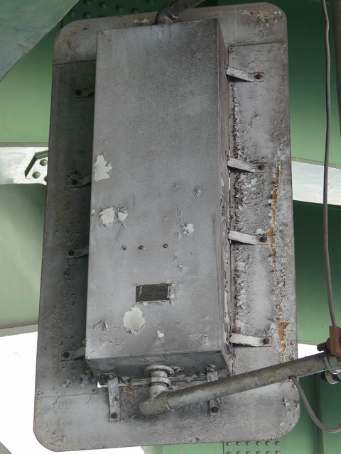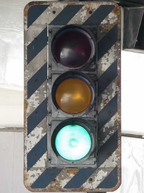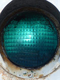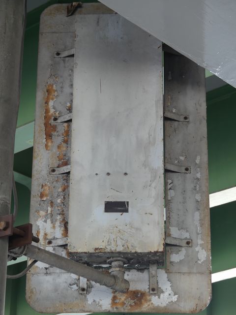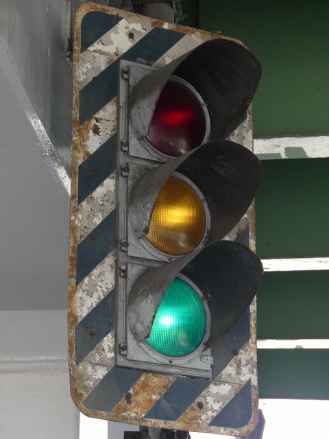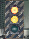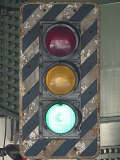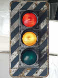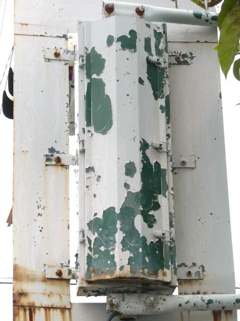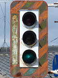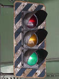 高架下のロータリー型交差点で主灯器として設置されていた300φ縦型灯器(表蓋)です。灯器は高架下の設置で暗く、背景が明るいので、灯器を目立たせるために背面板が設置されていました。
