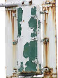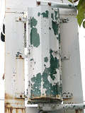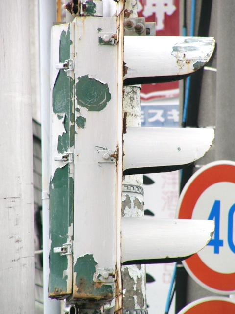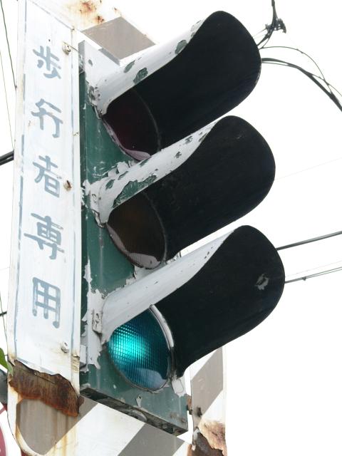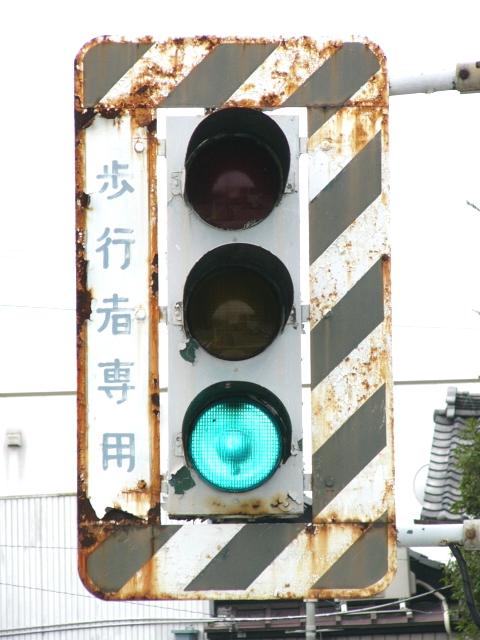 「歩行者専用」の縦型灯器です。白塗装が剥げて、地の緑色が見えています。