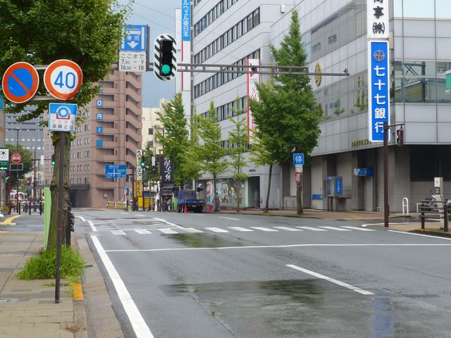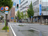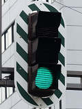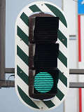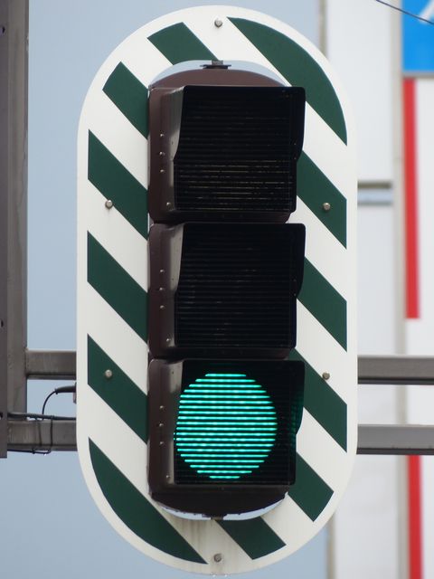 信号交差点直後の単路横断歩道の信号機です。手前の信号交差点から誤認しないように、距離制限フードが装着されていますが、それにより接近するまで信号があることに気付きにくいため背面板を併設しているようです。