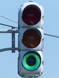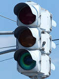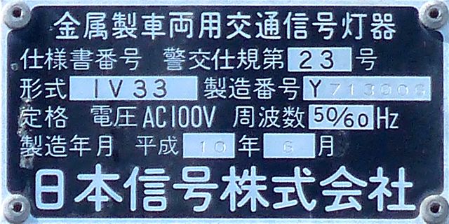 押ボタン式信号の主道路側に設置された多眼レンズの灯器です。多眼レンズは熱に弱いのか、点灯時間の長い青灯のレンズが真っ黒に焼けています。県内の同じ条件の箇所で、同様に青灯のみレンズ焼けした灯器をよく見かけます。