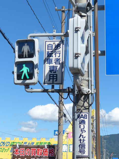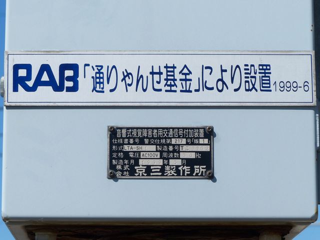 「通りゃんせ基金」で設置された音響式信号機です。信号柱に「通りゃんせ信号」の標示板が設置されています。制御機には「「通りゃんせ基金」により設置」のプレートが設置されています。東西方向(主道路平行側)で「通りゃんせ」、南北方向(従道路平行側)で「故郷の空」が流れます。