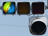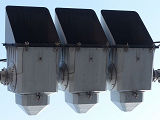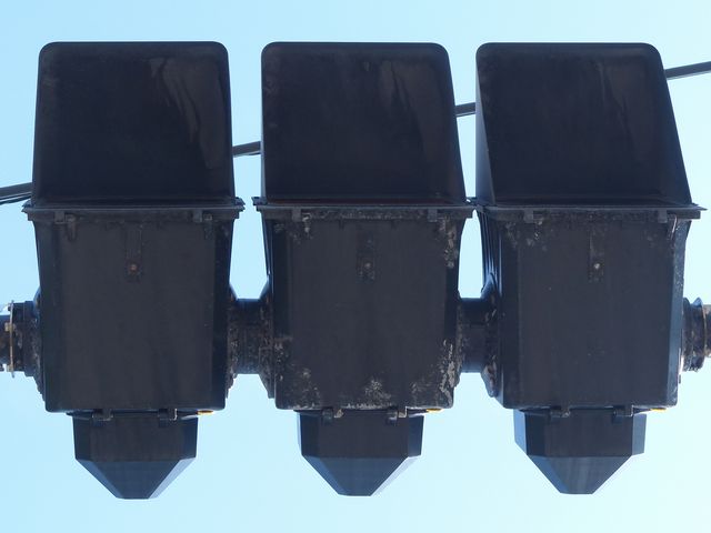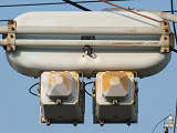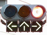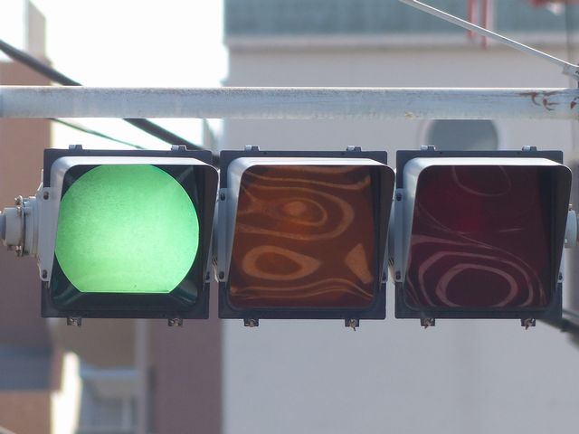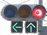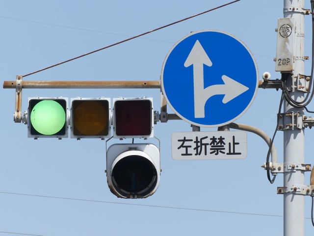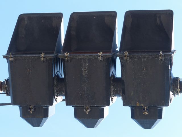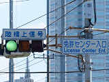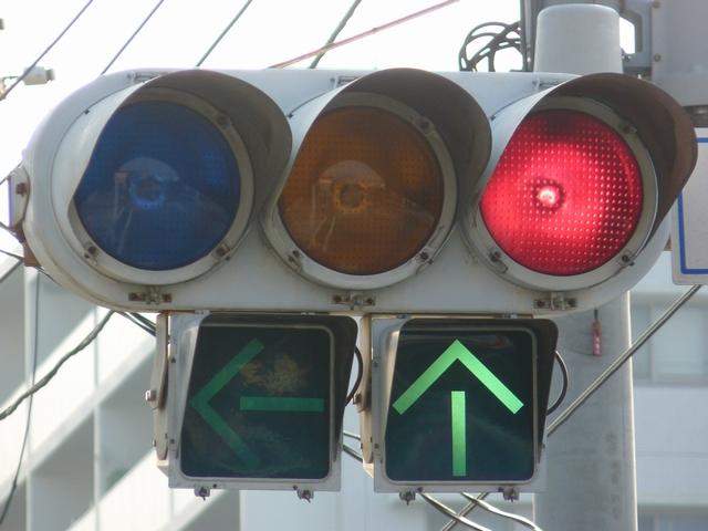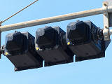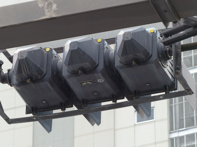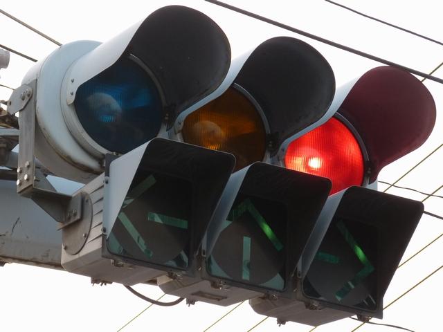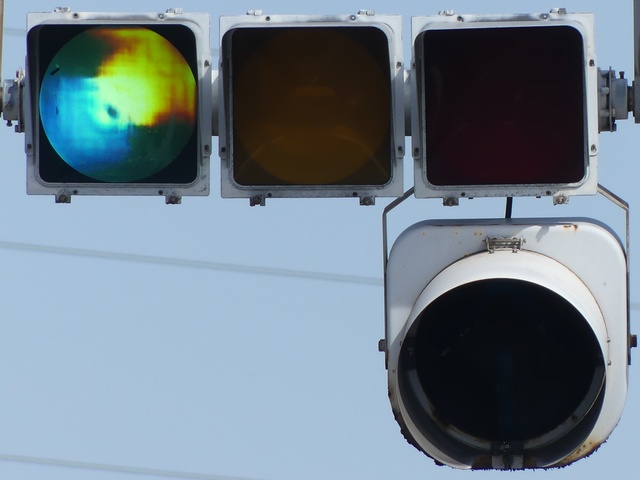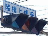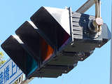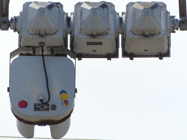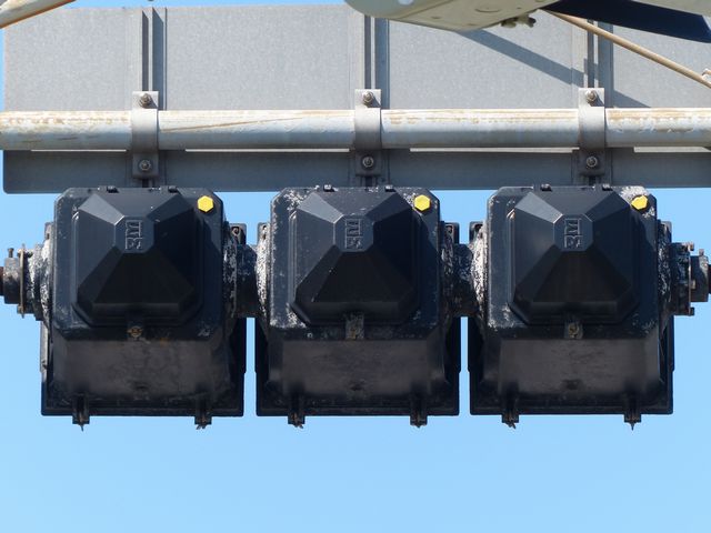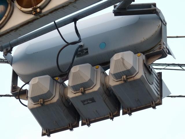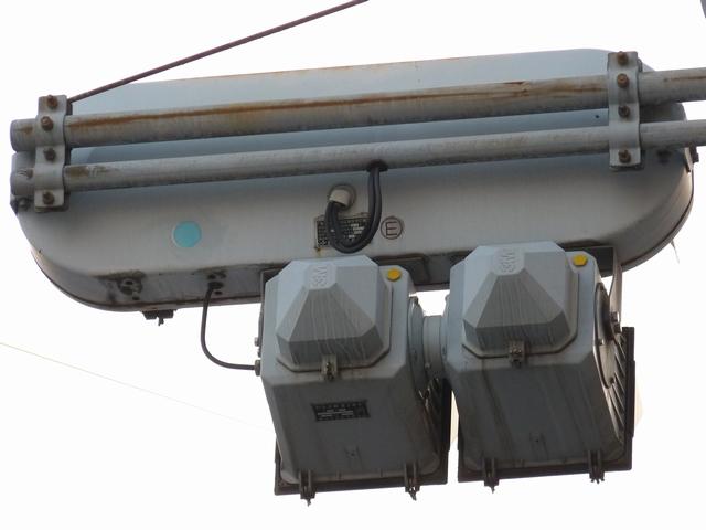 車線ごとに信号が異なる道路に対して、右方直進車線からの誤認防止のため、左方直進車線用の灯器に偏光灯器が使用されています。背面の「3M」のロゴが現行のタイプです。