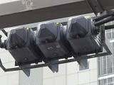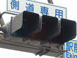 側道のある交差点で、本線、側道それぞれからの誤認防止のために、偏光灯器が使用されています。偏光灯器は、この交差点に3基設置されていますが、うち1基のみフードの長いものとなっています。