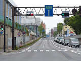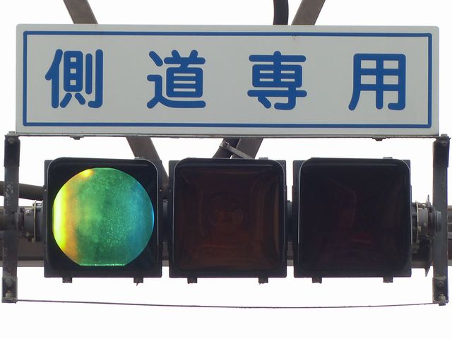 側道のある交差点で、側道からの誤認防止のために、本線用灯器に偏光灯器が使用されています。背面の「3M」のロゴが古いタイプです。