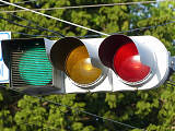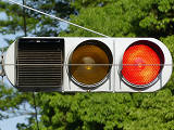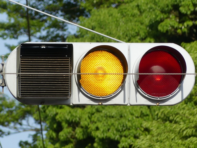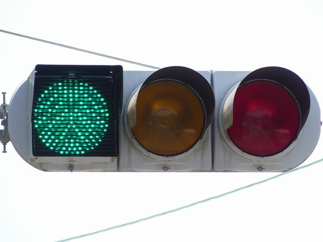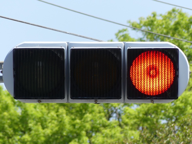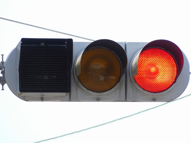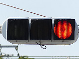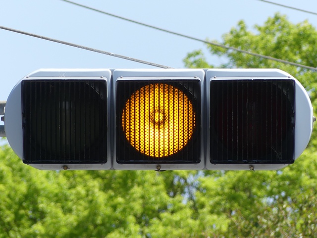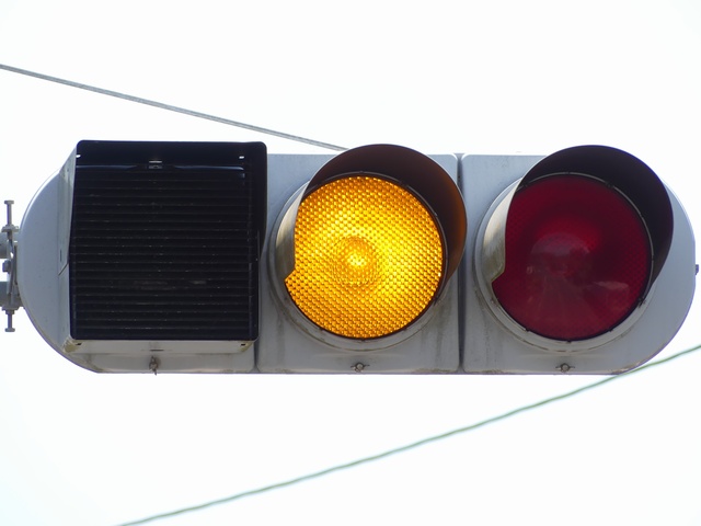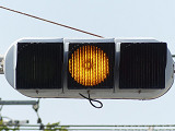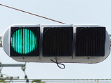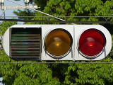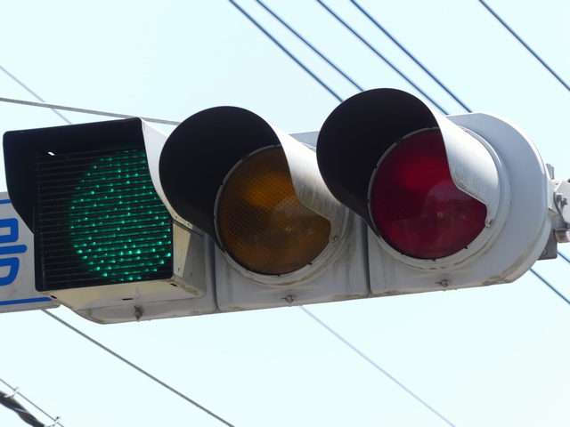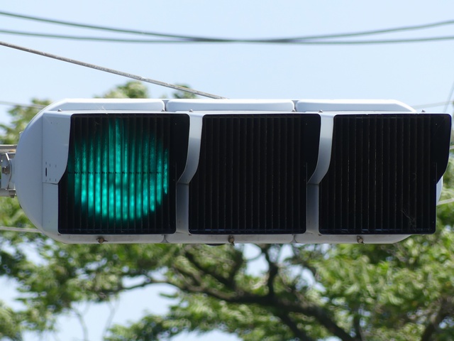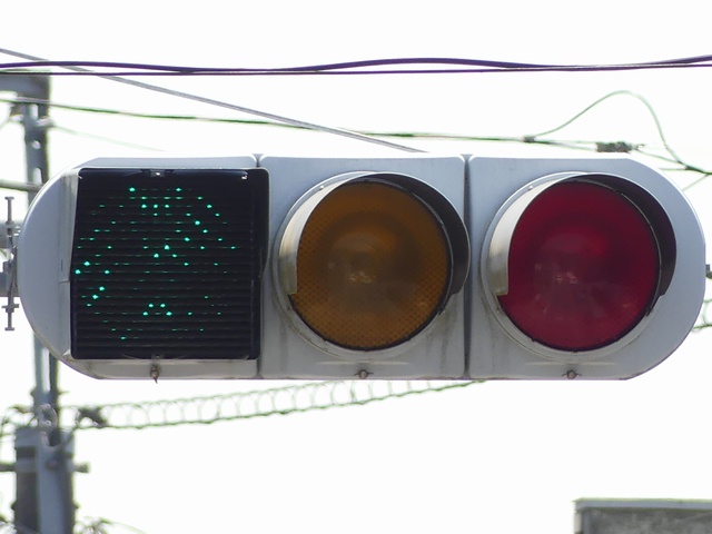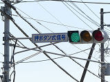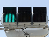 連続信号交差点で、手前交差点の車両が奥交差点の信号を誤認しないよう、青灯のみ距離制限のSD制限フードの灯器が設置されています。制限フードの青灯のみがLED式(素子型)です。電球式の青灯とSD制限フードの組み合わせでは灯火が暗く見えると判断し、青灯のみLED式としたのでしょうか。