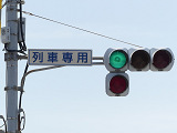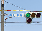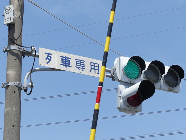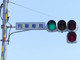 信号交差点に近接する踏切に「踏切専用」の信号を表示する信号機が設置されています。踏切信号は、赤灯火の故障が重大事故につながるため、3色灯器の下に予備の赤1位式灯器が併設されています。通常は青信号で、列車が接近すると3色灯器が黄、赤になり、赤の1位式灯器は使用しません。