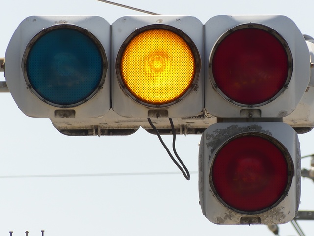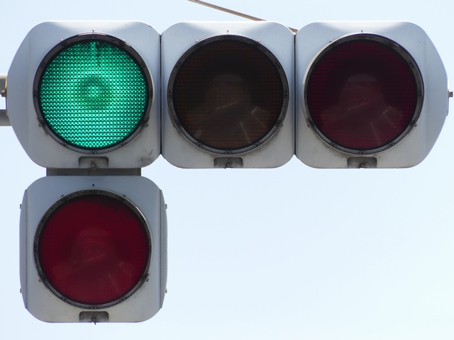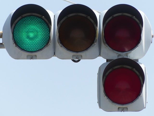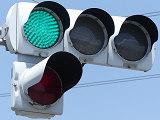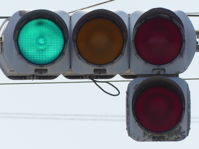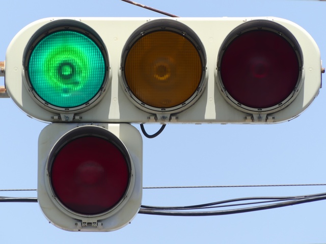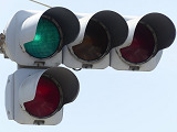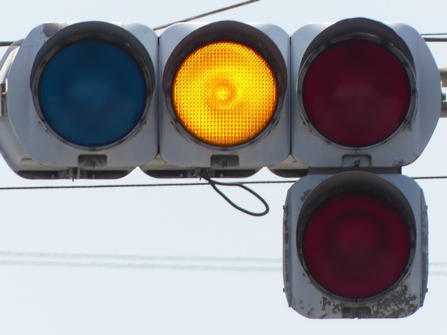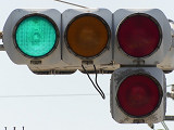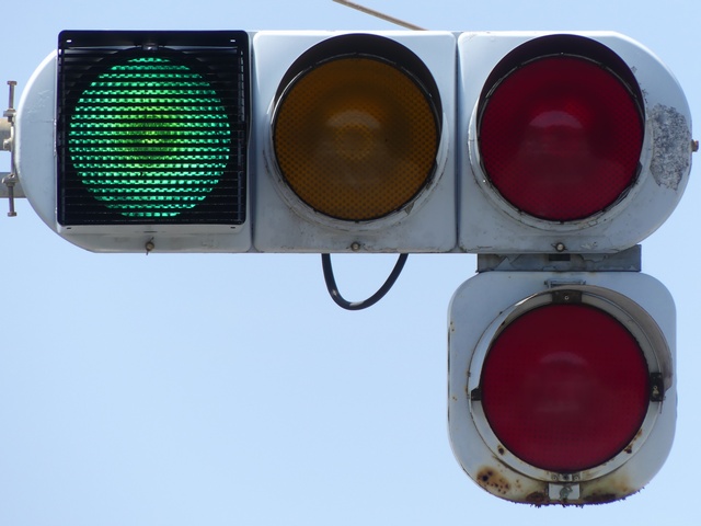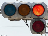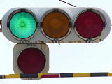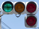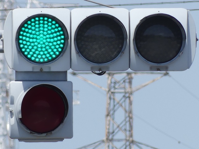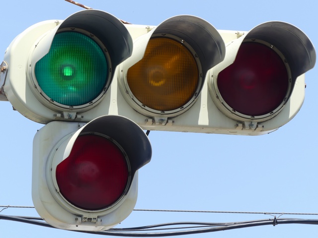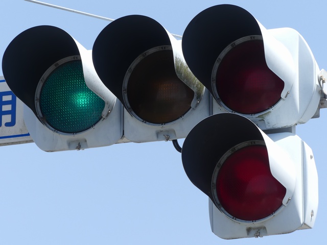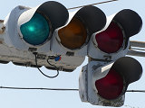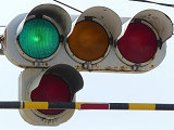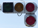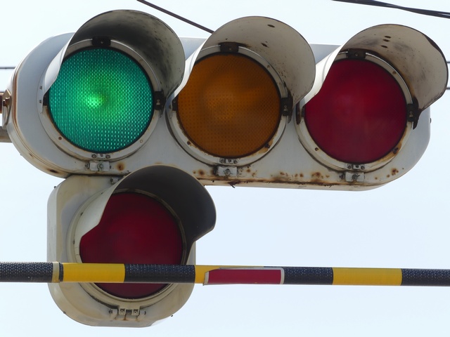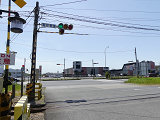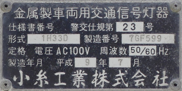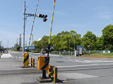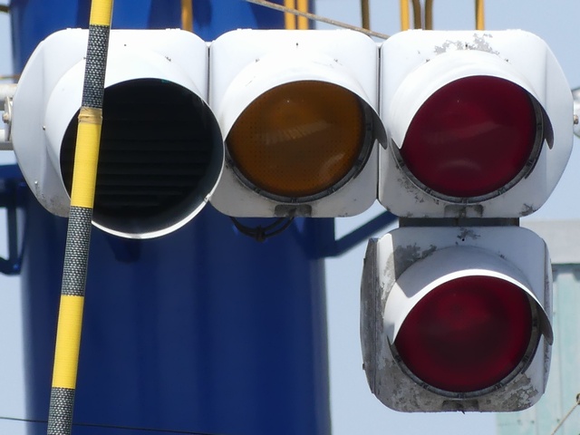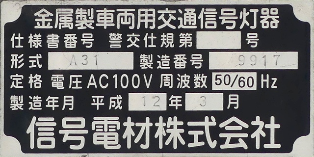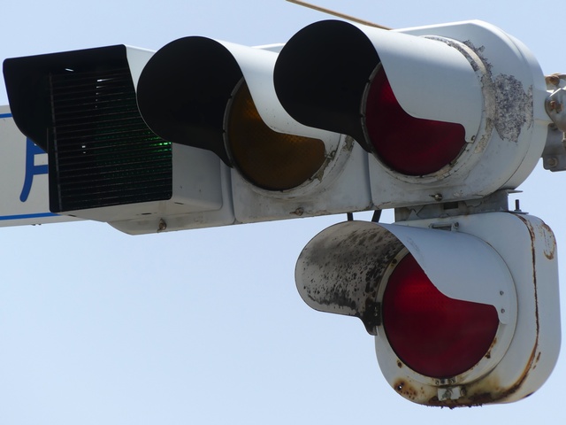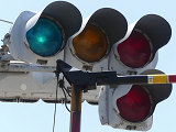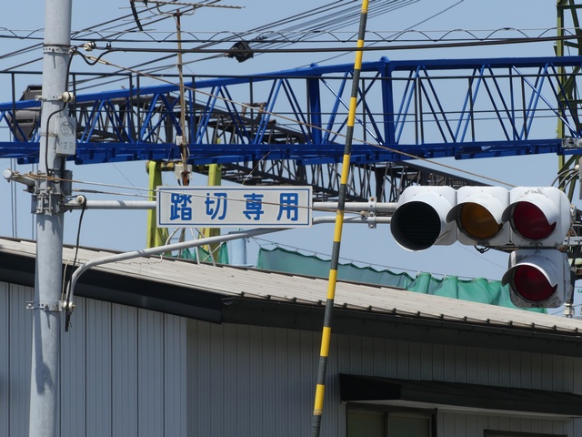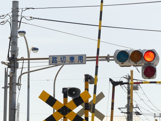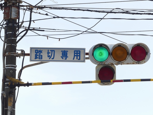 信号交差点に近接する踏切に踏切信号が設置されています。踏切信号は、赤灯火の故障が重大事故につながるため、3色灯器の下に予備の赤1位式灯器が併設されています。通常は青信号で、列車が接近すると3色灯器が黄、赤になり、赤の1位式灯器は使用しません。