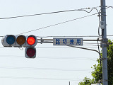 信号交差点流出側は、交差点からの誤認防止のために青灯のみ距離制限フードが取り付けられています。