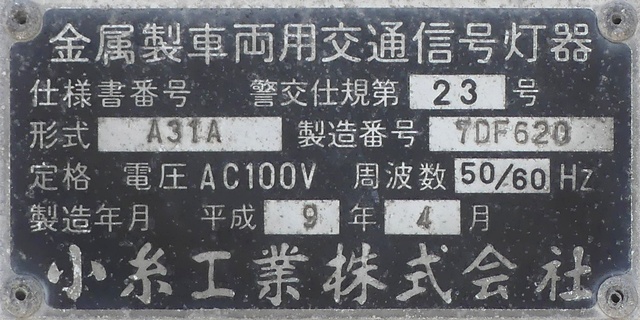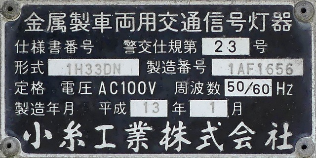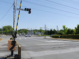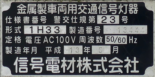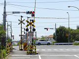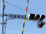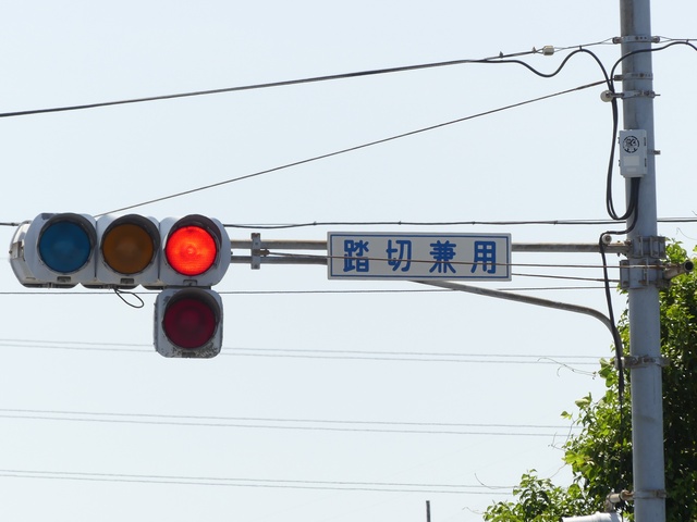 信号交差点に隣接する踏切に踏切信号が設置されています。踏切信号は、赤灯火の故障が重大事故につながるため、3色灯器の下に予備の赤1位式灯器が併設されています。交差点流入側は交差点用信号を兼ねており「踏切兼用」の標示板が併設されています。交差点流出側は交差点用信号からは独立しており「踏切専用」で、通常は青信号、列車が接近すると3色灯器が黄、赤になり、赤の1位式灯器は使用しません。