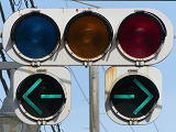 直進先が車両進入禁止(軽車両を除く)のため、青信号にならず、左折、右折の矢印信号で進行させていますが、矢印点灯時に赤灯を点灯させていません。なお、赤灯が同時に点灯していないと矢印信号は意味を持ちません。