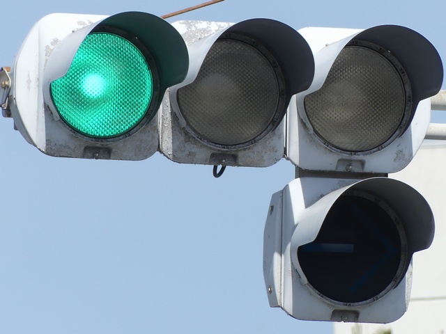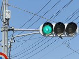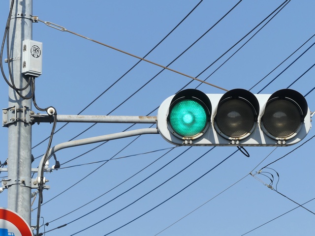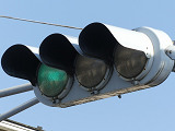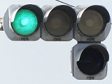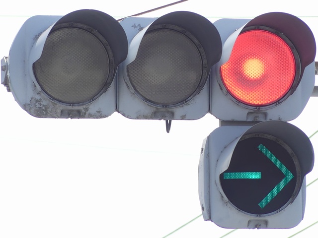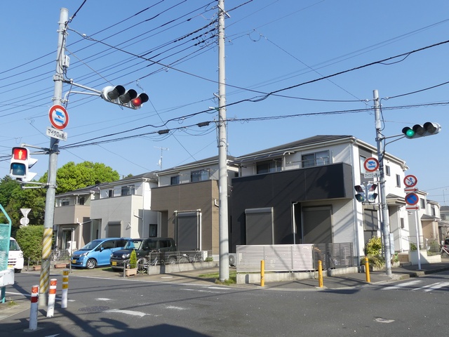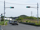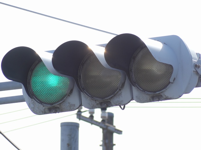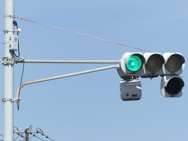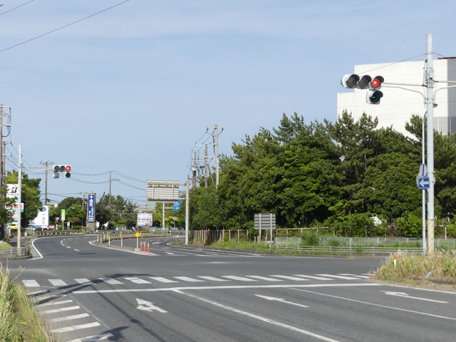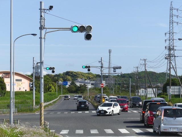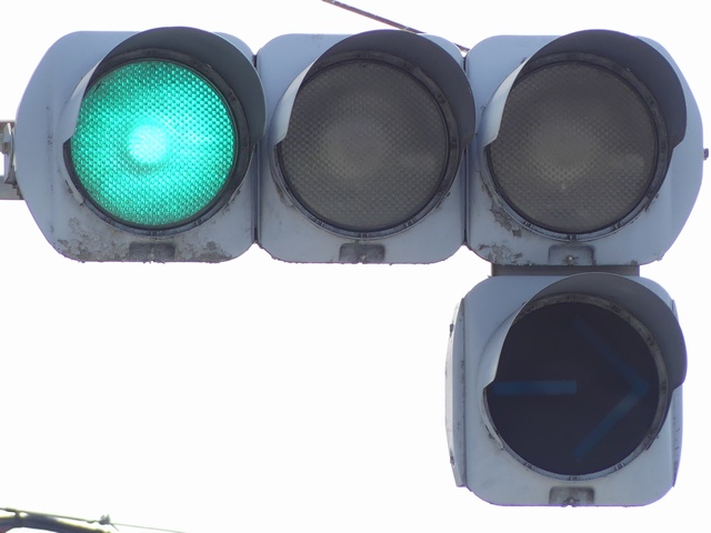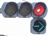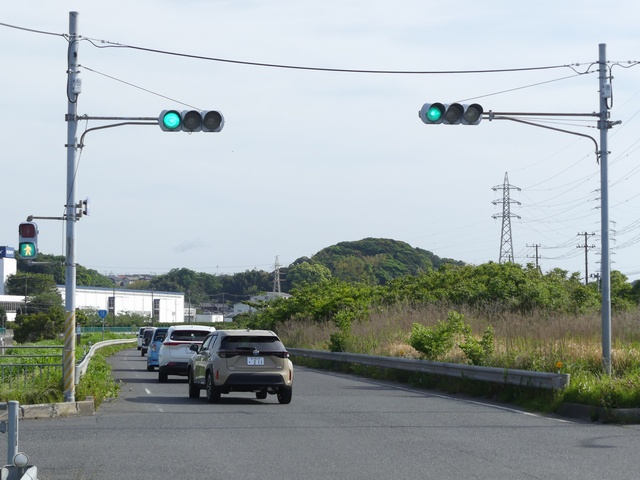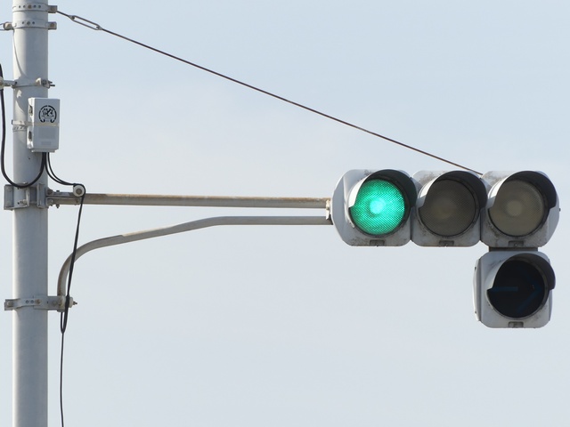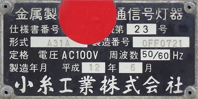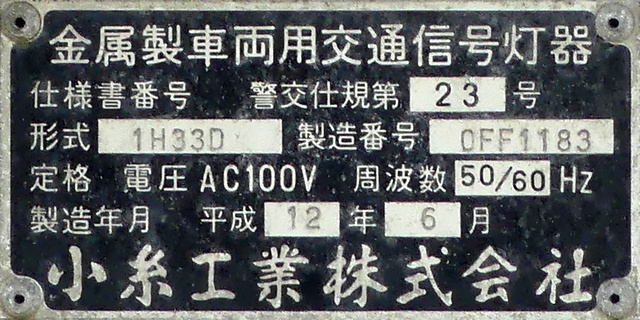 従来の電球式灯器を無色レンズにして、常盤電業製の「TYライト(TYCタイプ)」を装着したLED式灯器です。青灯、黄灯、赤灯の背面に「LED13」のラベルが貼られており、平成13年度にTYライトが装着されたと思われますが、灯器は平成12年6月製で1年ずれがあります。矢印灯器は電球式です。この交差点に10台設置されていましたが、令和5年度工事で低コスト灯器に交換されました。