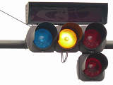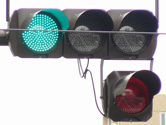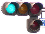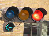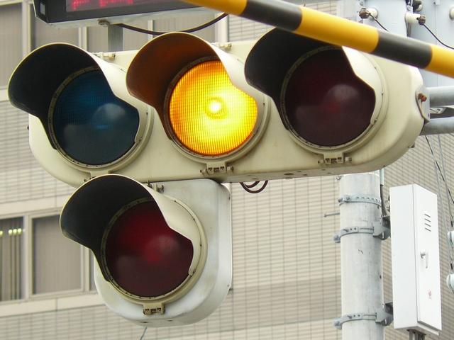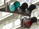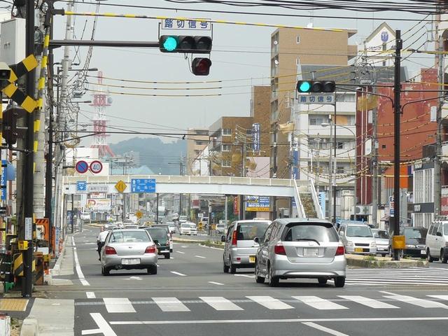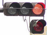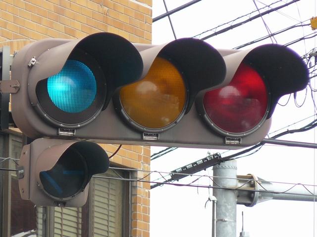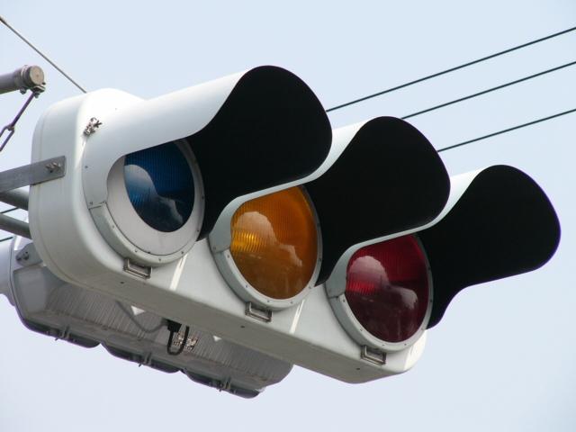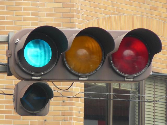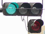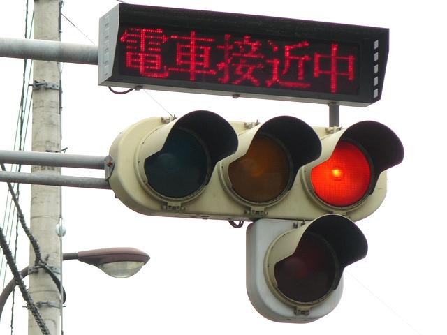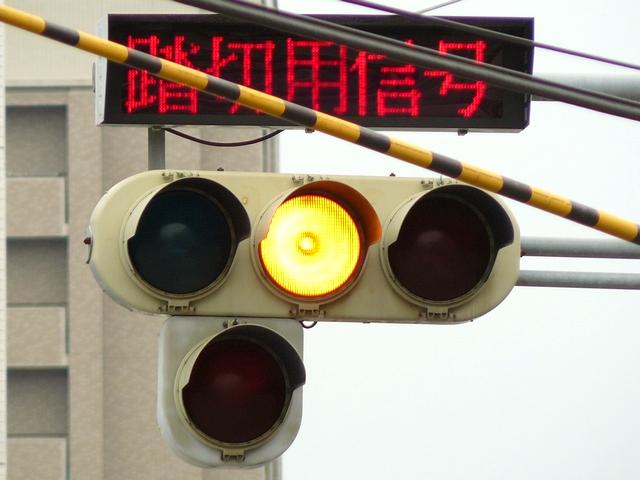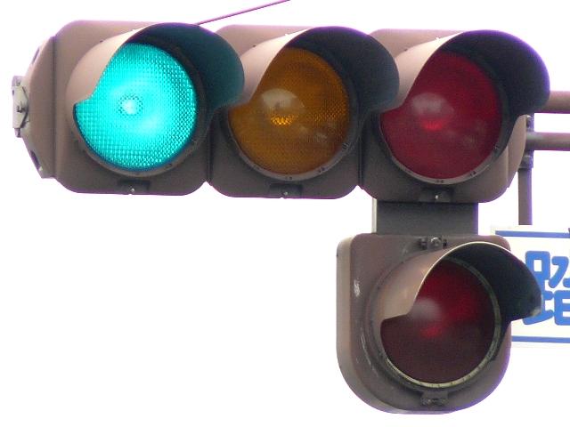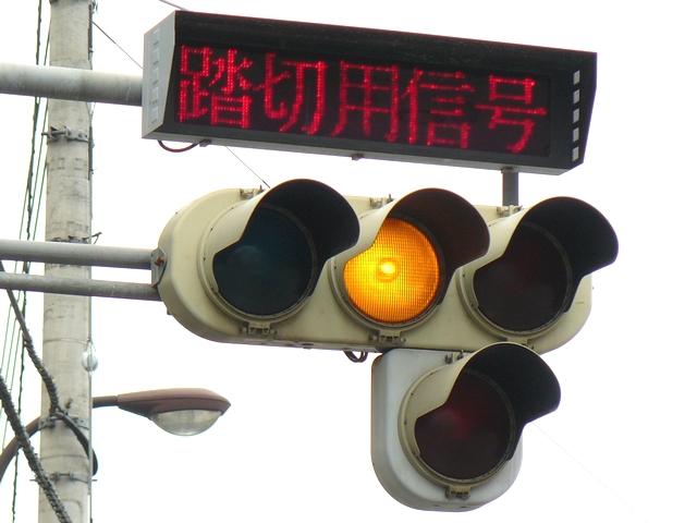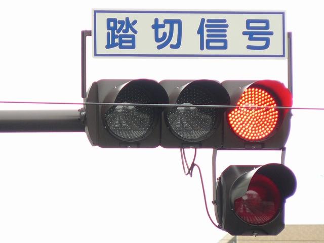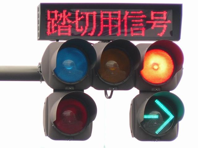 「踏切信号」で通常は青信号ですが、列車が接近すると本灯器の信号が赤になります。おまけの赤は普段、点灯しません。従道路は通常赤点滅ですが、列車が接近すると赤信号で左折矢印が出ます。