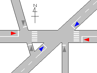 7差路のうち変則的に交差しており交通量の少ない3方向に赤・黄・赤灯器が設置されています。ただし左赤は使用されず、右赤が点滅します。ほかの方向の車両に対して青信号を表示しているときに赤点滅により一時停止で同時に交差点内に進入させます。