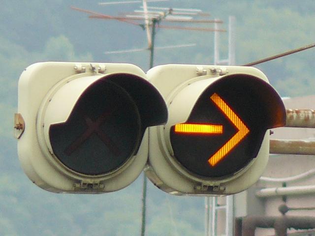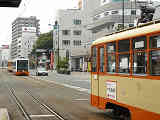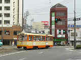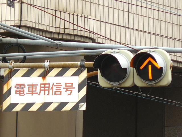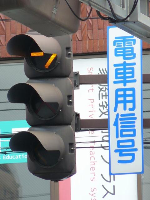 路面電車が屈折する交差点です。本灯器の後ろ向きに電車用の矢印灯器を設置しているものもあります。詳しい動作は確認していません。