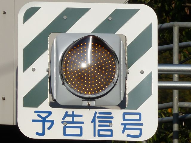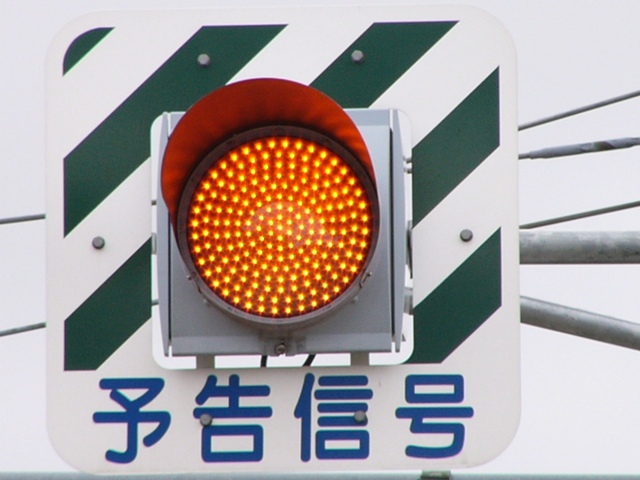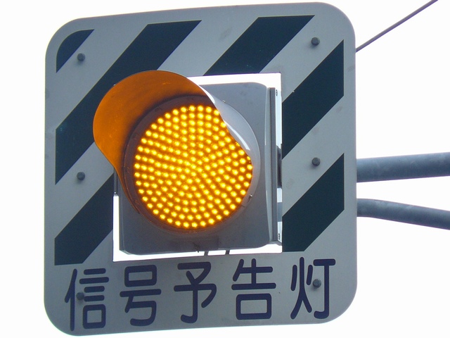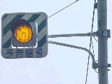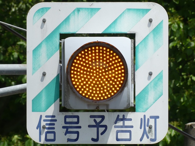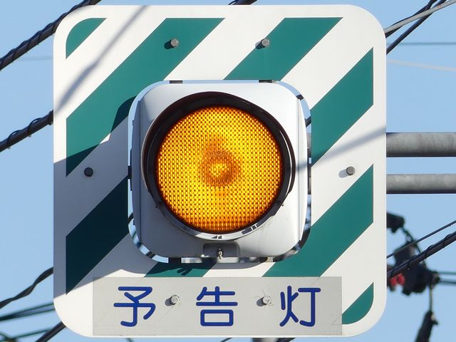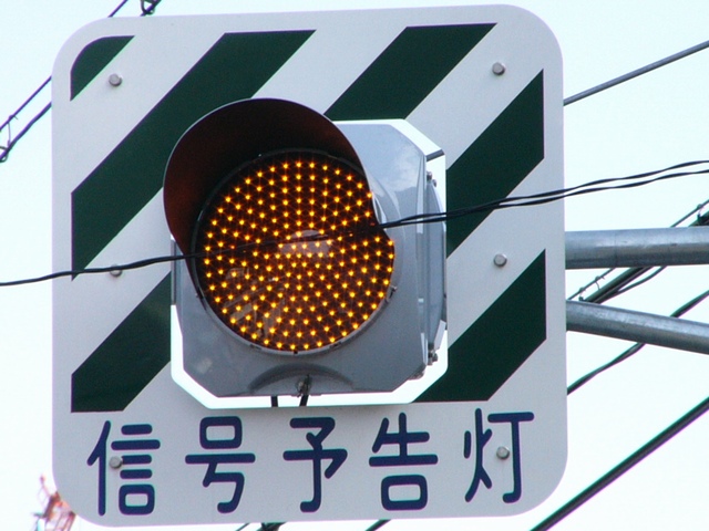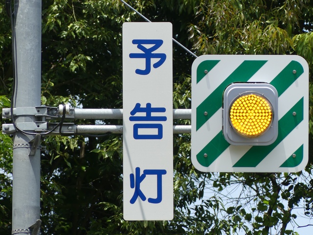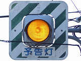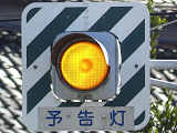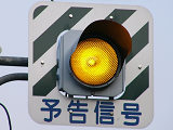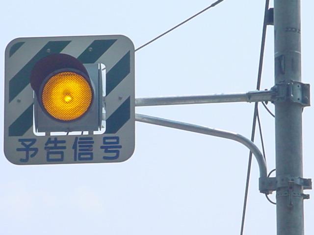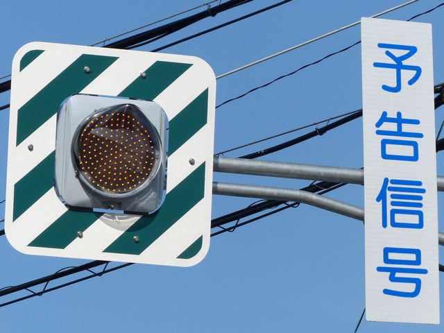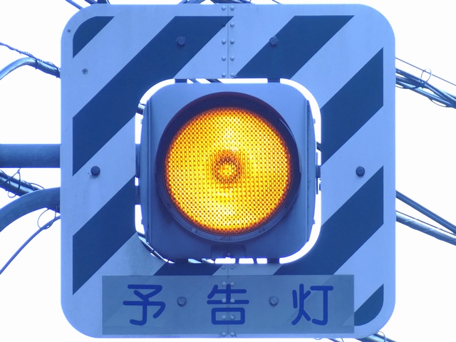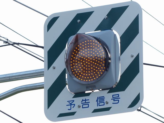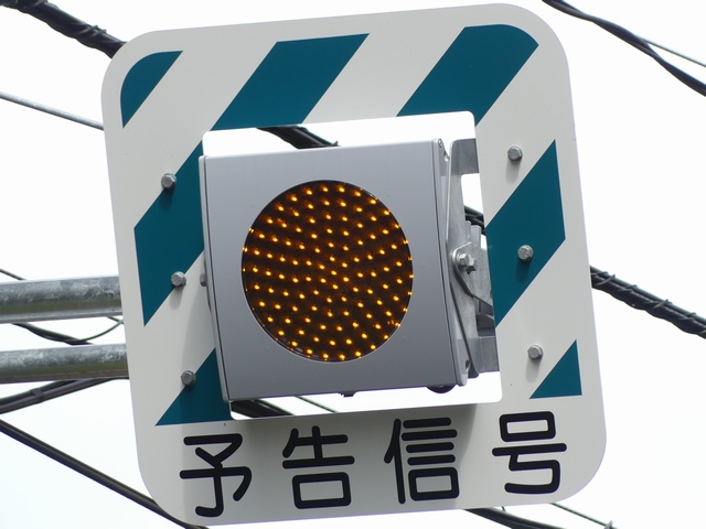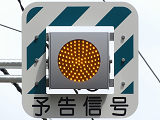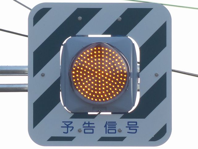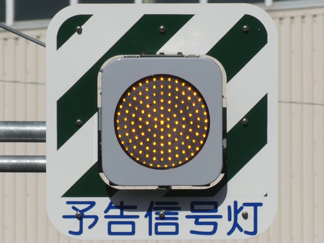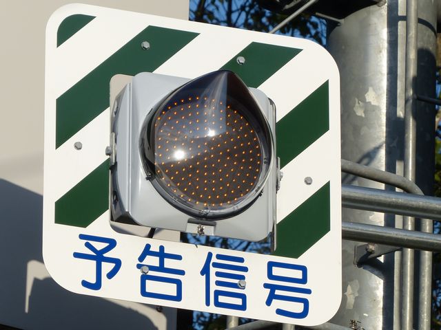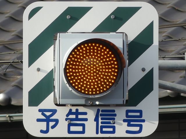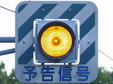前方の信号が黄になるとこの「予告信号」は黄点滅を始め、前方の信号が青になると「予告信号」は滅灯します。
