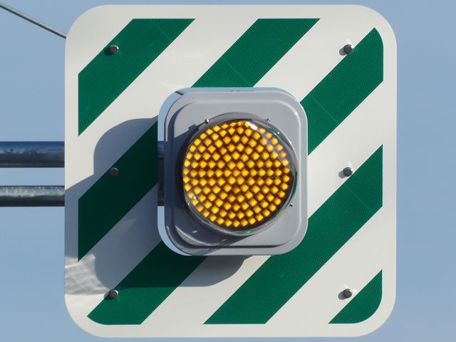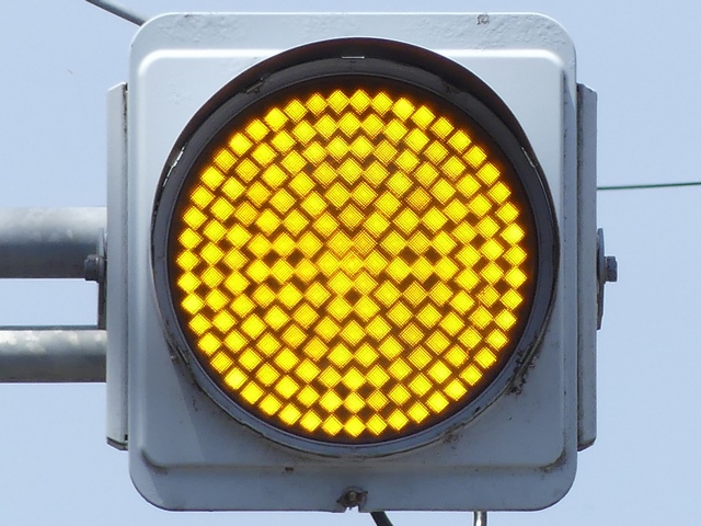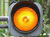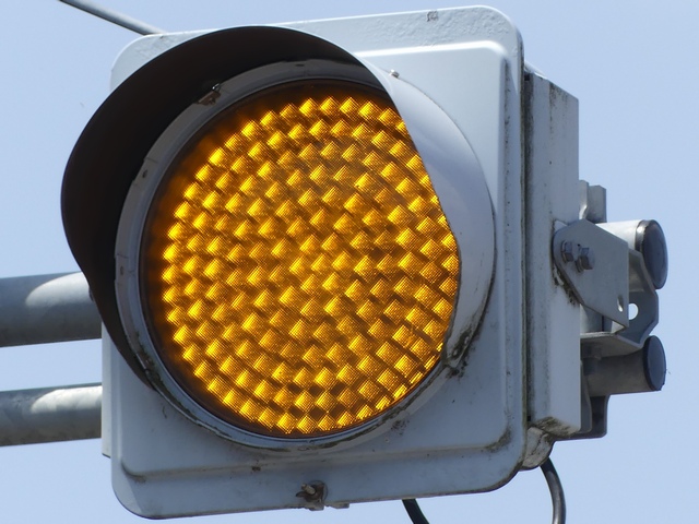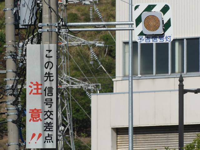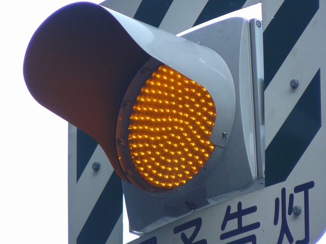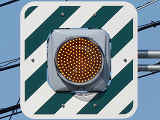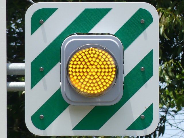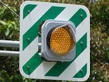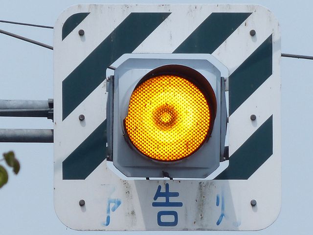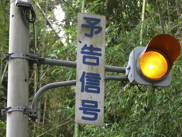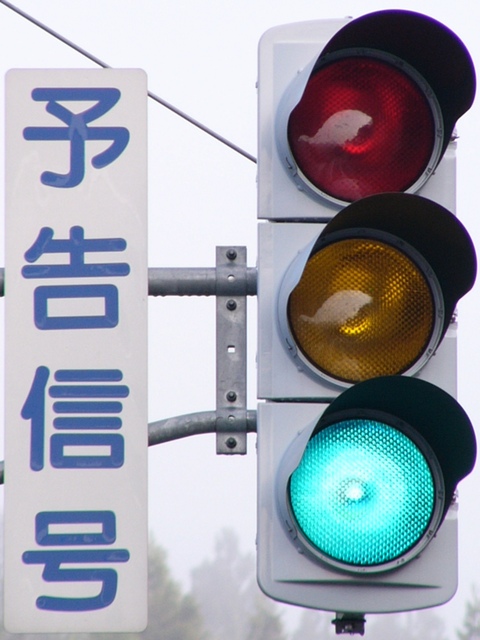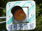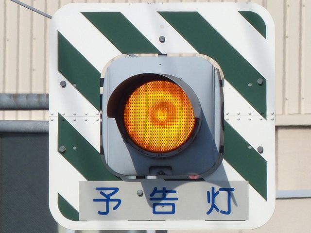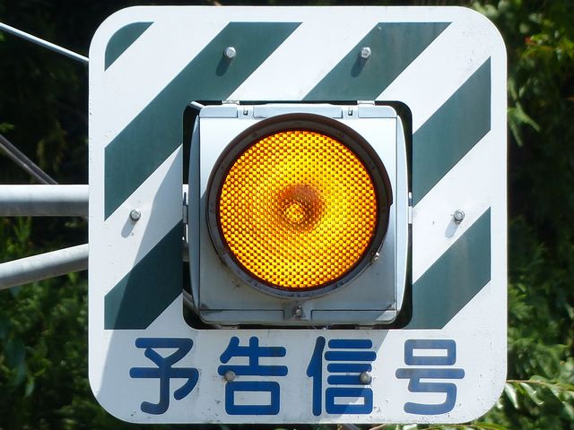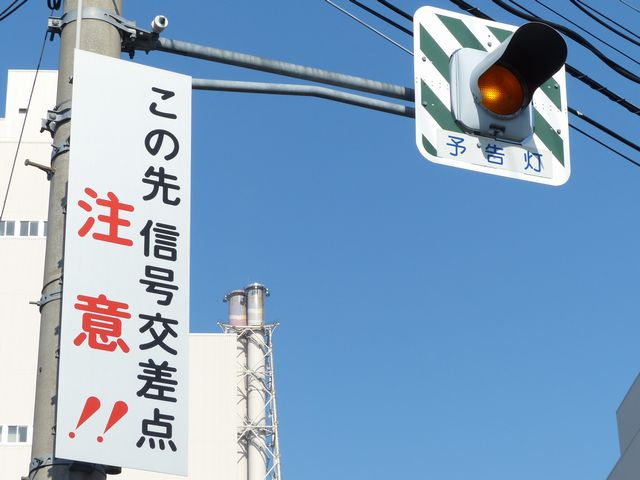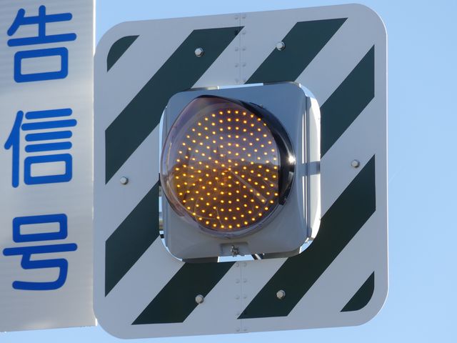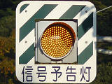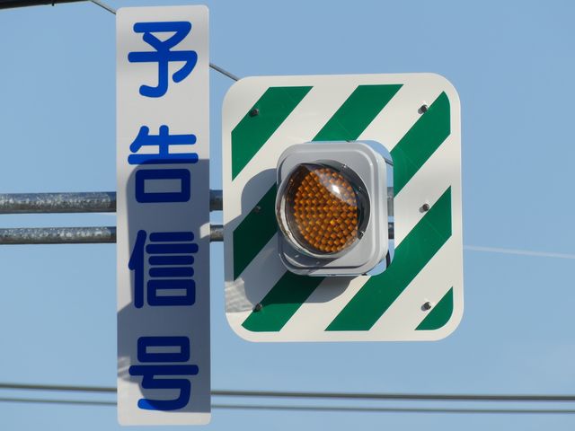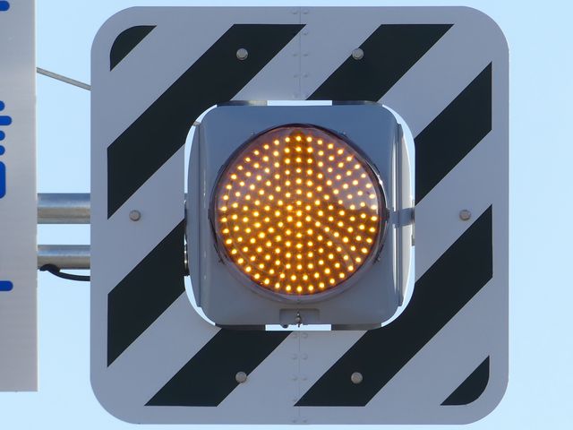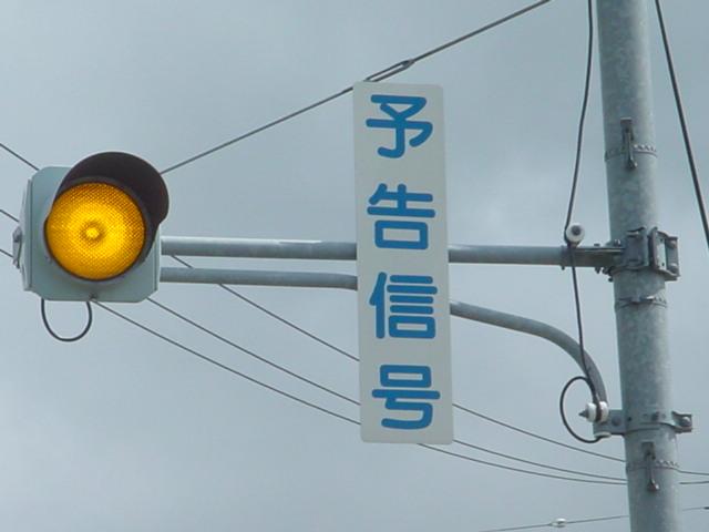 前方の信号が黄になるとこの「予告信号」は黄点滅を始め、前方の信号が青になると「予告信号」は滅灯します。
