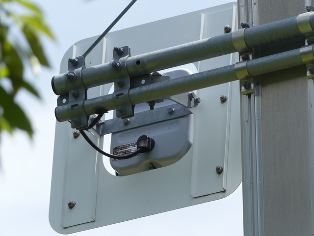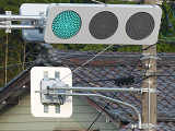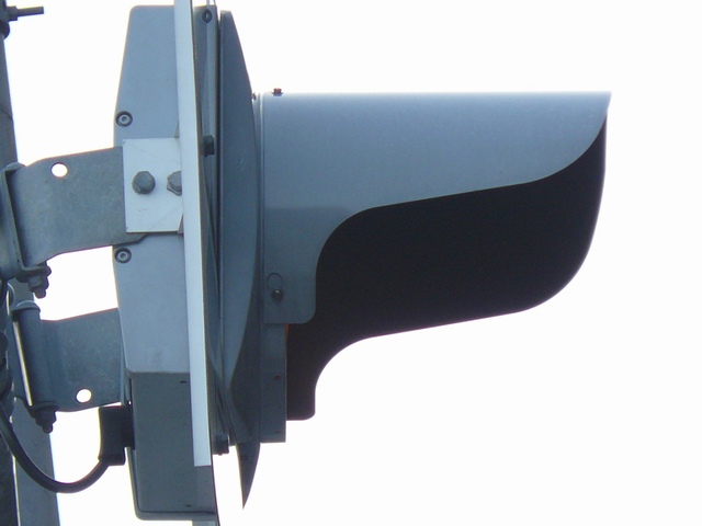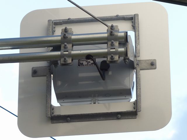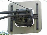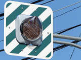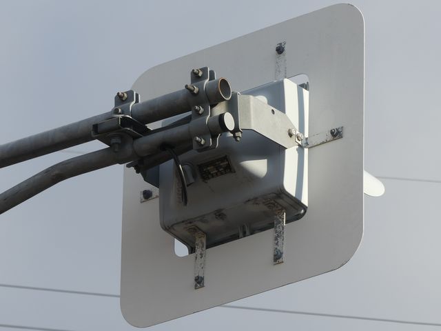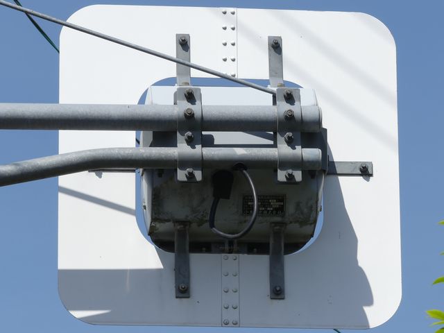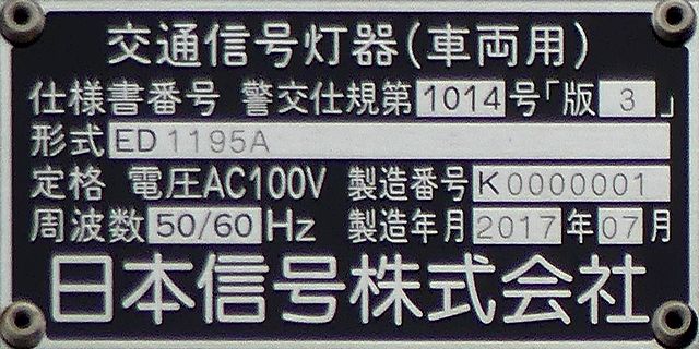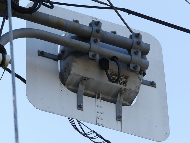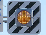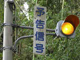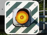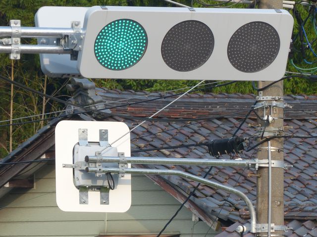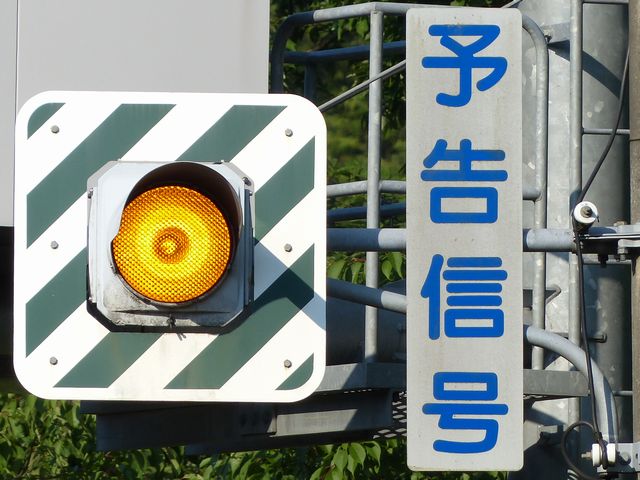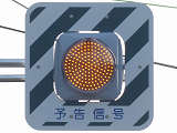 1位式の「予告信号」と3色灯器の「予告信号」を連続して設置しています。前方の信号が黄になると1位式の「予告信号」は黄点滅を始め、前方の信号が青になると滅灯します。3色灯器の「予告信号」は前方の信号と同じサイクルです。