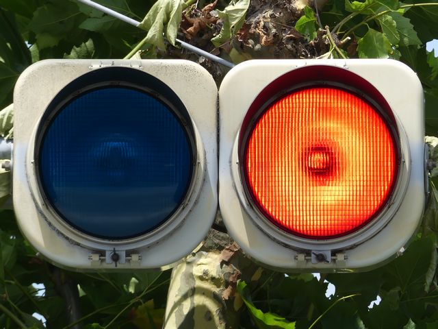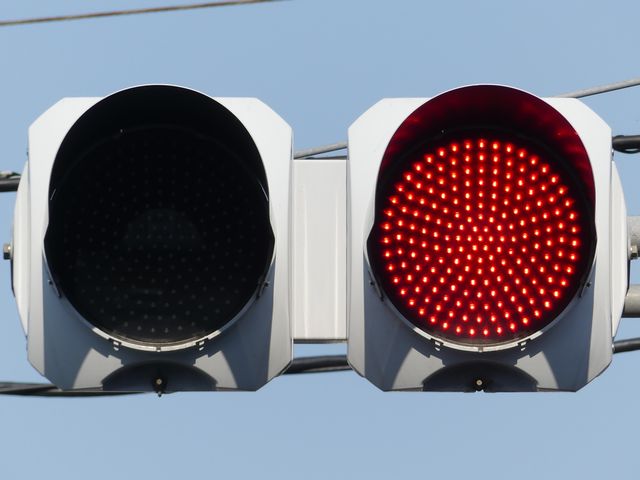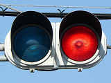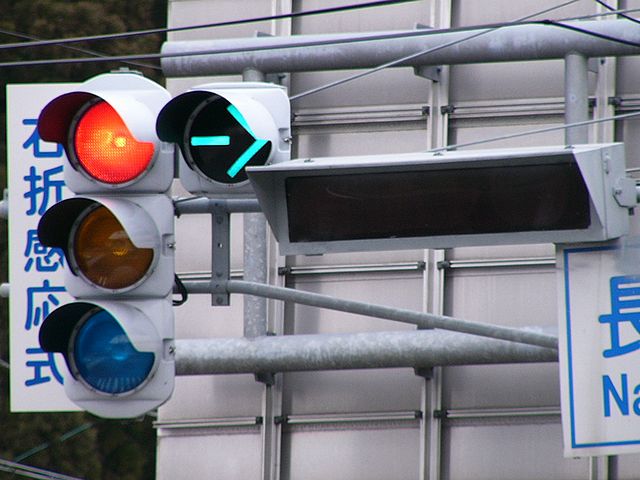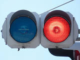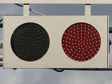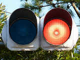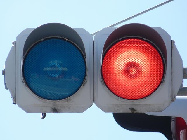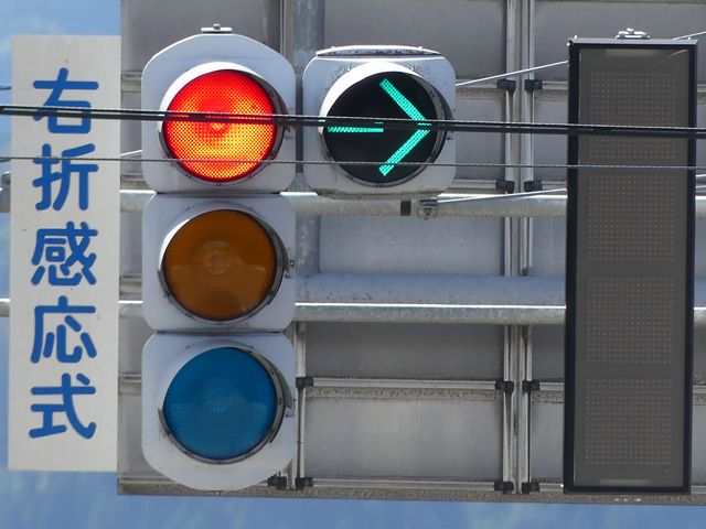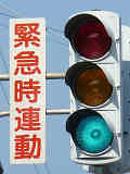 交通量の多い国道の信号交差点脇の消防署出口に青・赤の2位式灯器が設置されており、通常は赤点滅となっています。緊急車両出動時に消防署で信号を操作し、消防署側を青信号、隣接交差点は全赤にし、灯器併設の電光標示板に緊急車両出動により信号サイクルが変更されている旨を表示すると思われます。