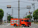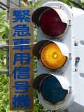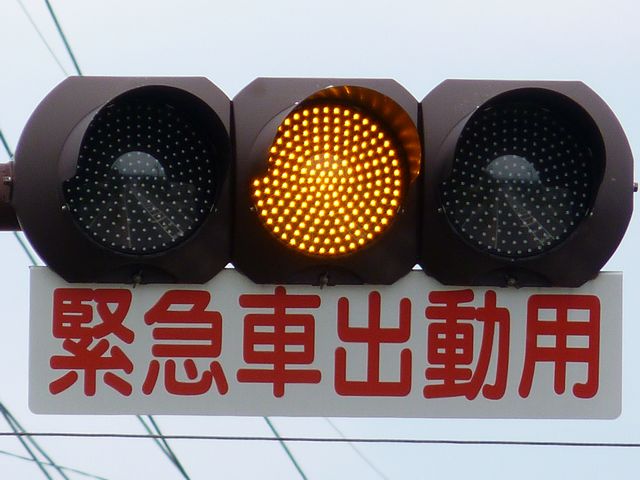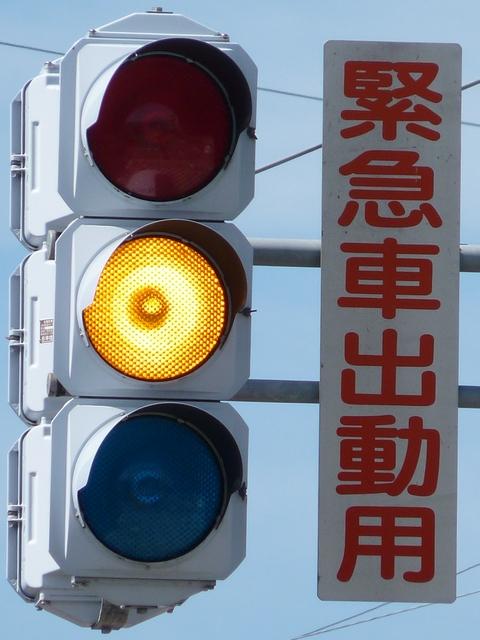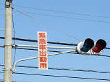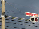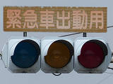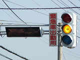 交通量の多い国道に面した消防署の出入口に信号機が設置されています。消防署側に青・赤の2位式灯器が、道路側には3色灯器(「緊急車出動用」標示板あり)が設置されています。通常は、消防署側が赤点滅、道路側が黄点滅となっています。緊急車両出動時に消防署で信号を操作し、消防署側を青信号、道路側を赤信号にします。