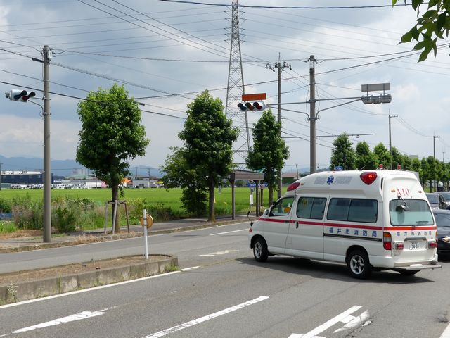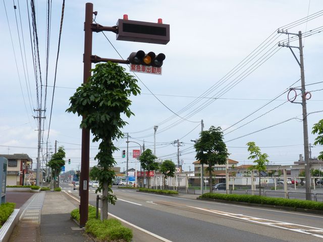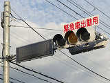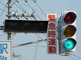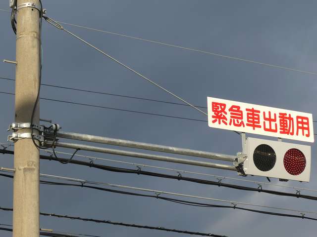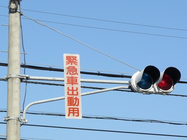 近接した信号交差点には電光標示板が設置されています。本来は、緊急車両出動時に連動して信号サイクルが変更され、電光標示板にその旨の表示が出ると思われます。