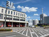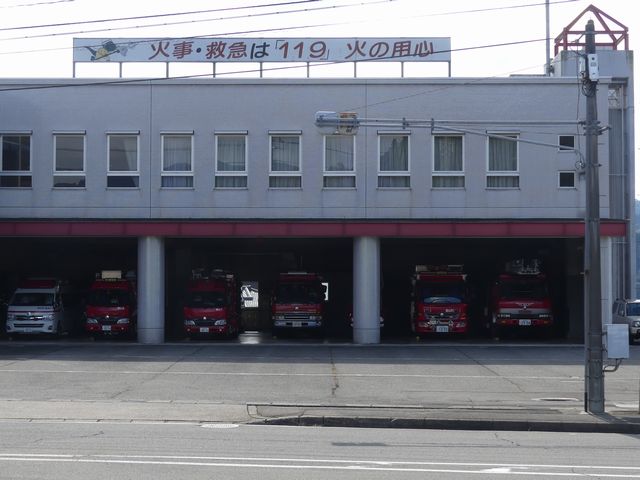 交通量の多い国道に面した消防署の出入口に信号機が設置されていますが、使用されておらず、常時滅灯状態となっています。緊急車両出動時も点灯しません。「調整中」や「工事中」の表示があるわけでもなく、パッと見ると故障しているように見えます。消防署側に青・赤の2位式灯器が、道路側には3色灯器(「緊急車出動用」標示板あり)が設置されています。
