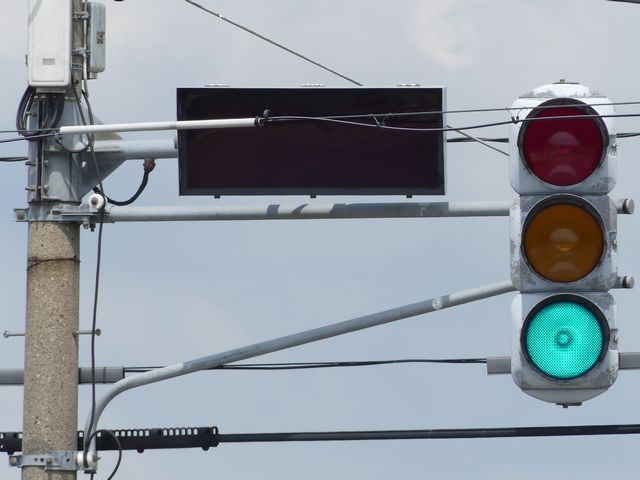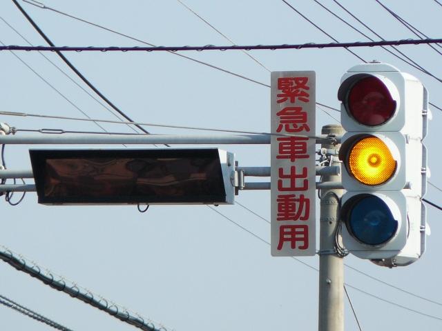 近接した信号交差点には電光標示板が設置されています。緊急車両出動時に連動して信号サイクルが変更され、電光標示板にその旨の表示が出ると思われます。