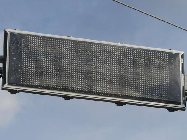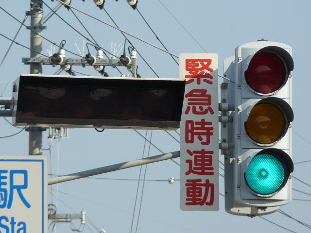 150mほど離れたた信号交差点の信号機には「緊急時連動」標示板と電光標示板が併設されています。緊急車両出動時に連動して信号サイクルが変更され、電光標示板にその旨の表示が出ると思われます。