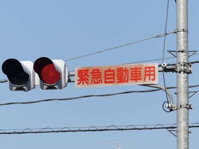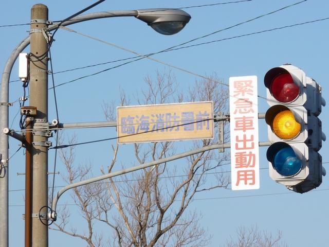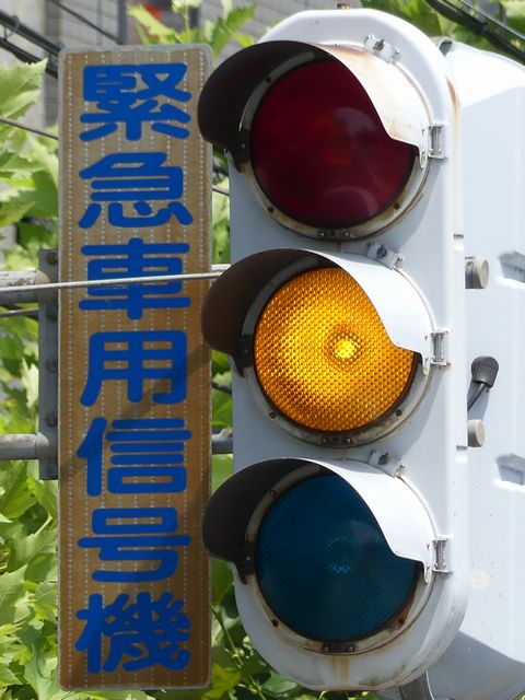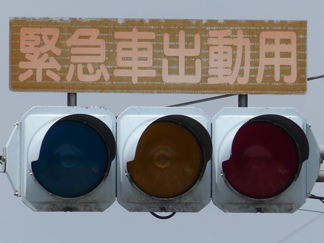 道路側の灯器に「緊急車用信号機」の標示板が併設されており、緊急車両のみが従う信号のような印象を受けます。