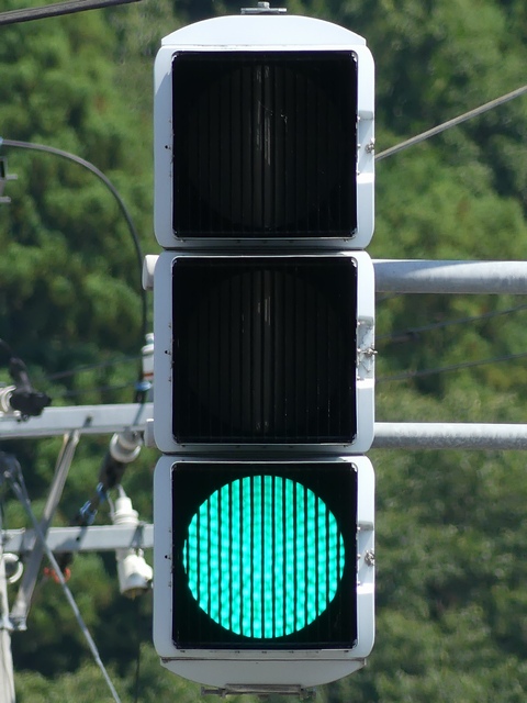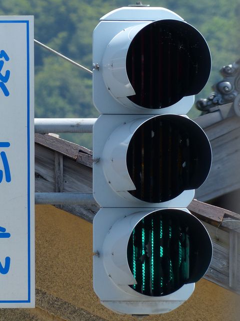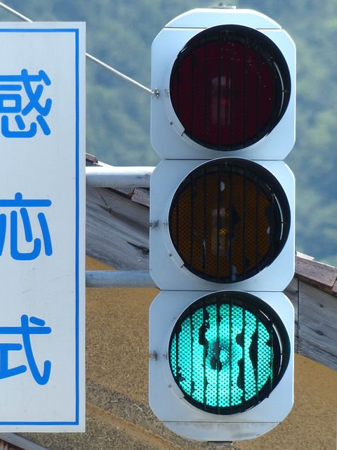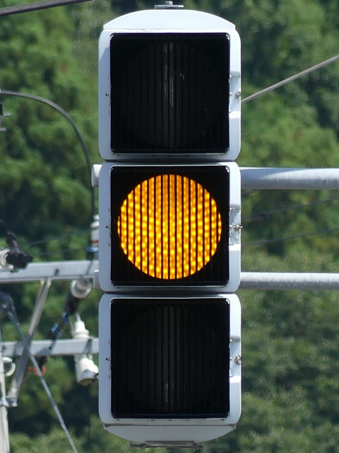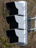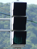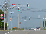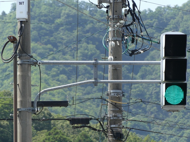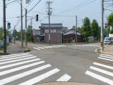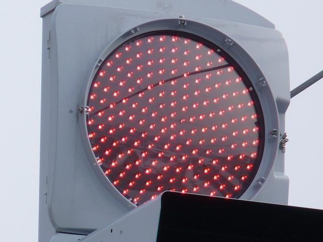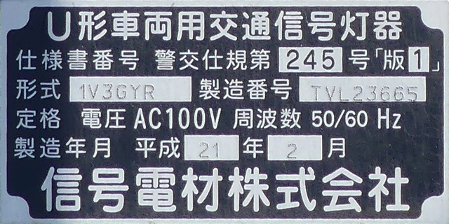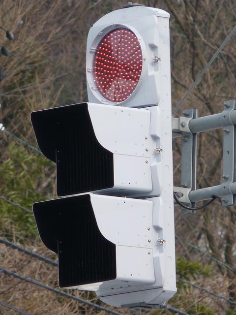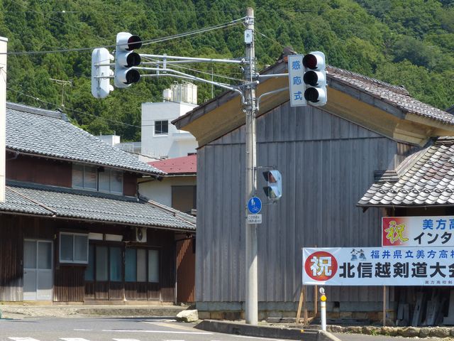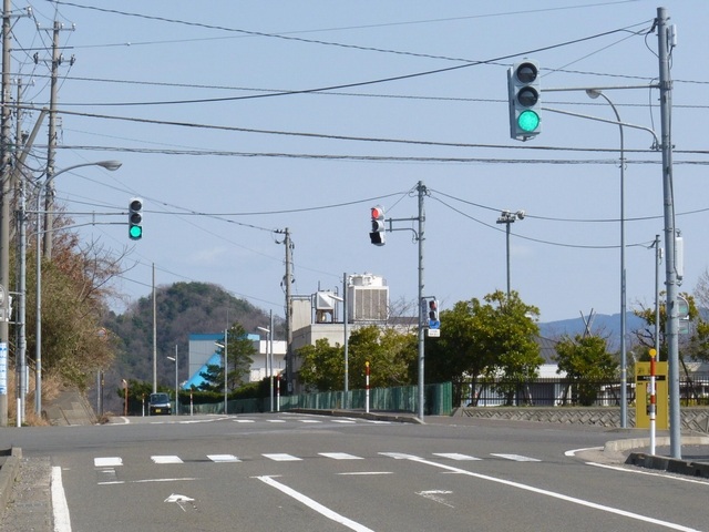 県内でSD制限フードによる左右制限は道路が平行になっている交差点か、かなり角度のきつい鋭角交差点のみで、この程度の鋭角の交差点では使用しません。この交差点の西隣の交差点は同程度の鋭角交差点ですが、特に誤認防止策はとられておらず、東隣の交差点はここよりきつい鋭角交差点ですが誤認防止策は片かくしフード程度です。 特に北進用灯器は交差点から奥まったところに設置されており、交差道路からの誤認のおそれはなさそうです。ただし、信号交差点のすぐ近くに交差する道路からの一時停止規制見落とし防止対策の可能性はあります。 交差道路は片側2.5車線のバイパスであり交差点は広いので、近隣住宅への防眩対策も考えにくいです。 薄型灯器に更新される前は特に誤認防止対策はとられていなかったと記憶しています。 越前警察署管内では下記の試験灯器が設置されたことがあるので、この灯器も試験設置の可能性がありますが、同時期に県内の複数箇所で鋭角交差点の誤認防止のための本設置もあり、試験設置も考えにくそうです。 ・フードに電熱線の入った灯器 ・縦型フラット型灯器 ・カプセルカバー ・赤のみカプセルカバー ・赤のみロングフード