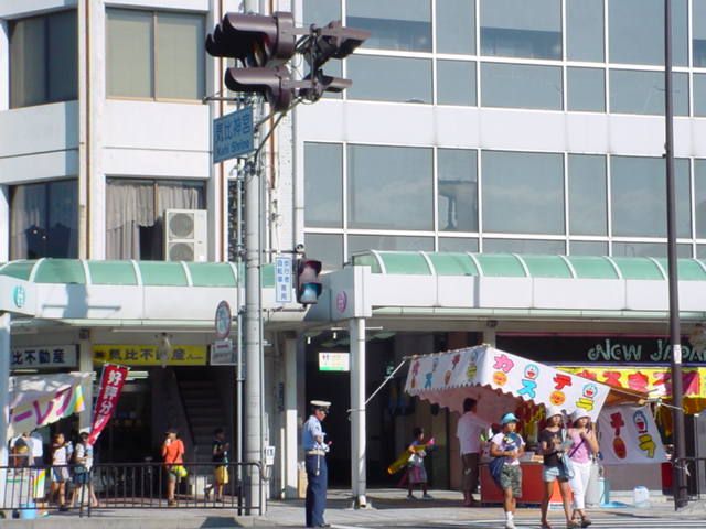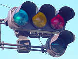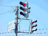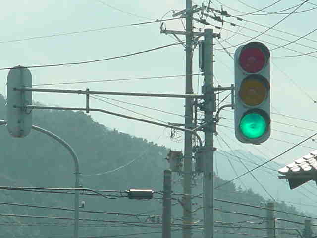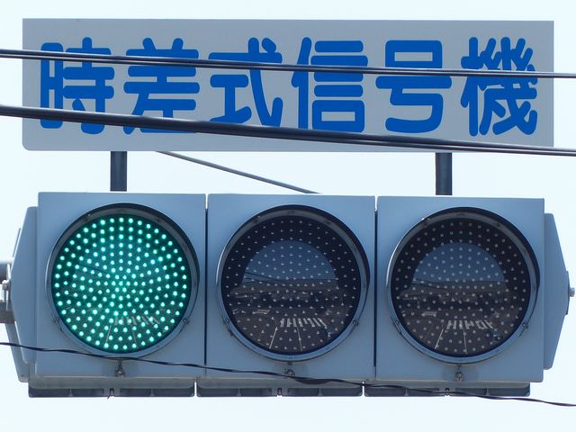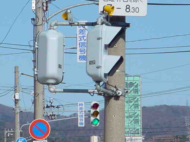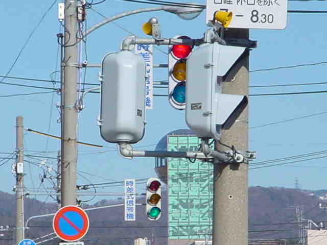 なお、この場所は、2002年2月当時は東西方向(この画像ではない方)だけが時差式でしたが、その後改良され現在は南北方向(この画像の方)も時差式となり、横型の「時差式信号機」標示板が併設されています。
