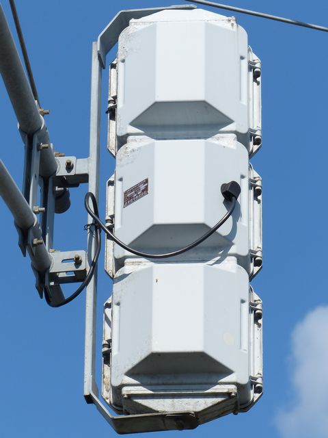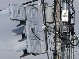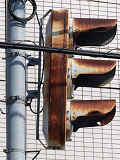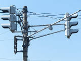 豪雪型縦型灯器と横型灯器が前後設置されています。本来は、両面とも縦型灯器で設置するところ、正面灯器を縦型設置すると、赤灯火が電線の端子箱で隠れてしまうため、横型設置したようです。縦型設置と横型設置では、上下アームの間隔が異なるため、上のアームのみ共用して下のアームはそれぞれ別に設置しています。