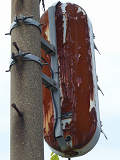 非常に状態の悪い灯器が転用で直付け設置されました。なぜか金具が上下逆に使用されているため、灯器が少し上向きになっています。
