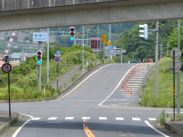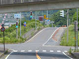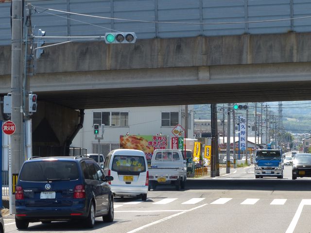 それら悪条件が重なったのがこの交差点です。交差点手前のカーブを走行中はまったく灯器が見えません。さらに悪いことに、連続交差点で手前の交差点の信号と奥の交差点の信号が異なるため、誤って奥の交差点の青信号を見て、手前の交差点に進入してしまうおそれがあり大変危険です。