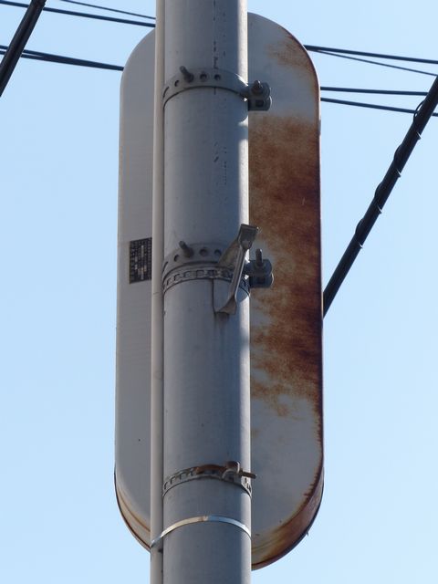 金具が上下逆に使用されているため、灯器が少し上向きになっています。下り坂の先に設置しているためあえてこうしているのでしょうか。