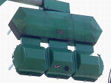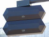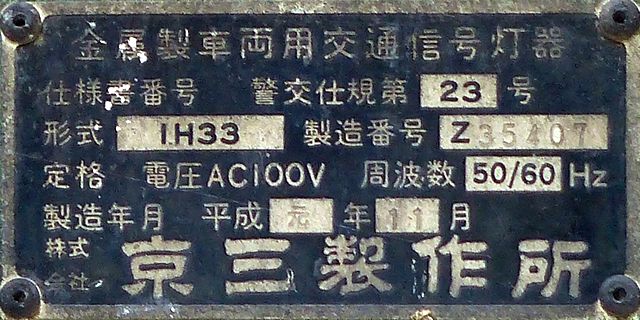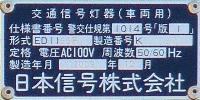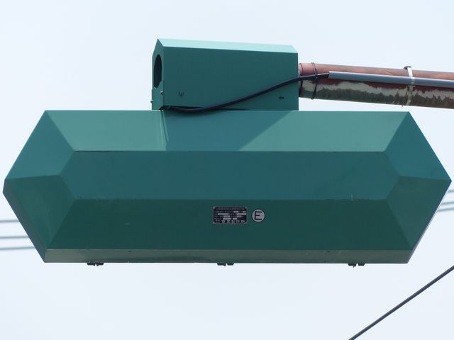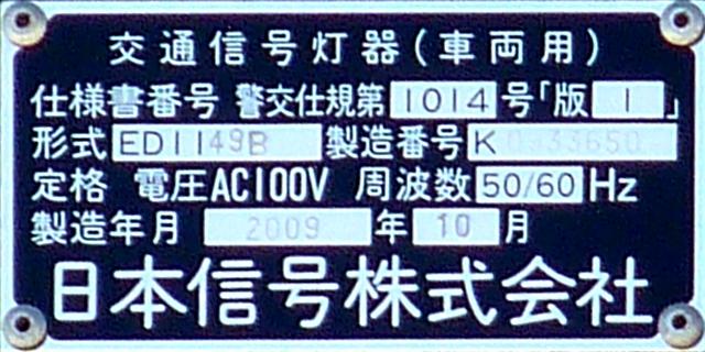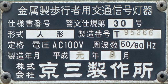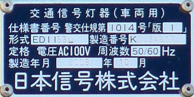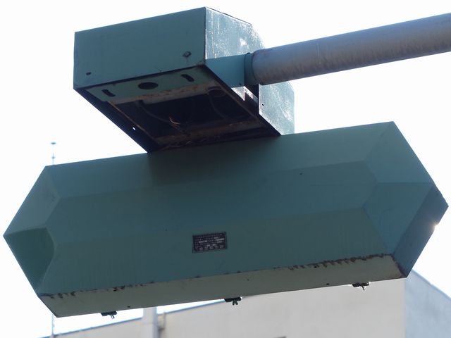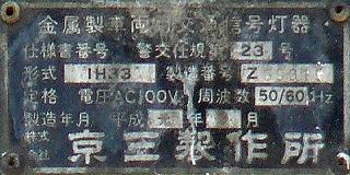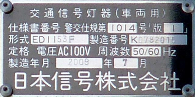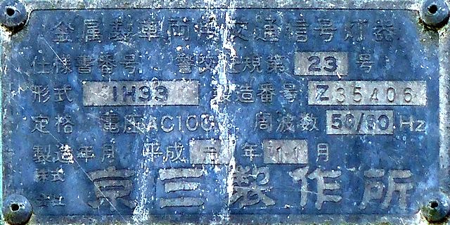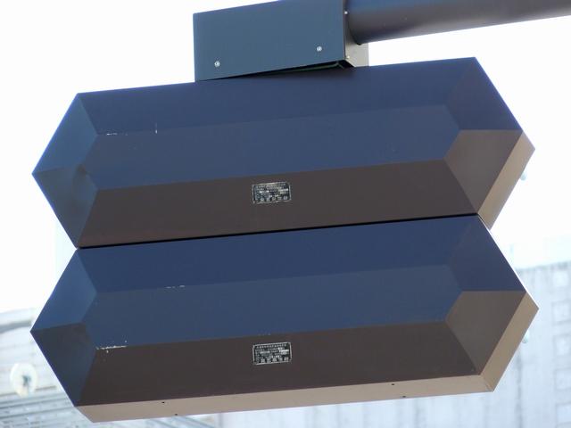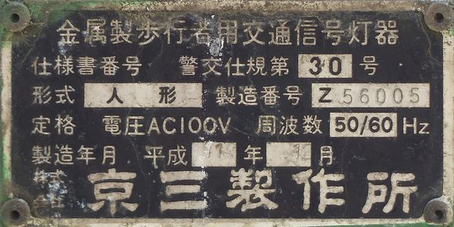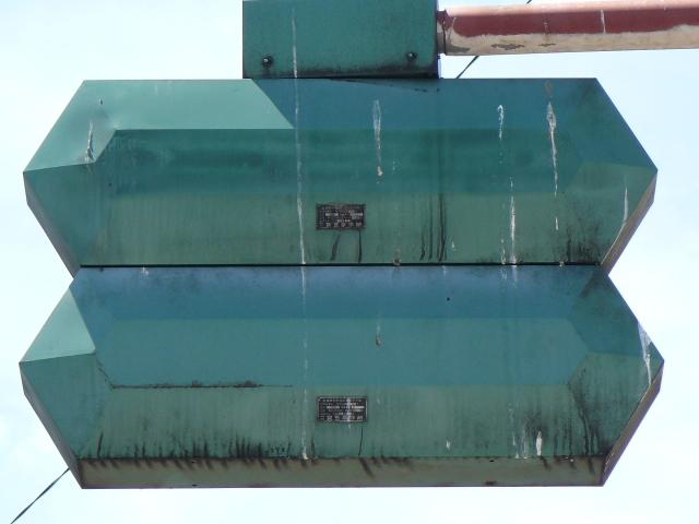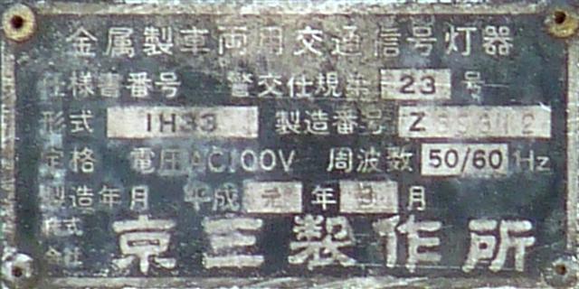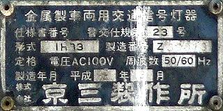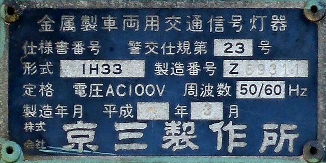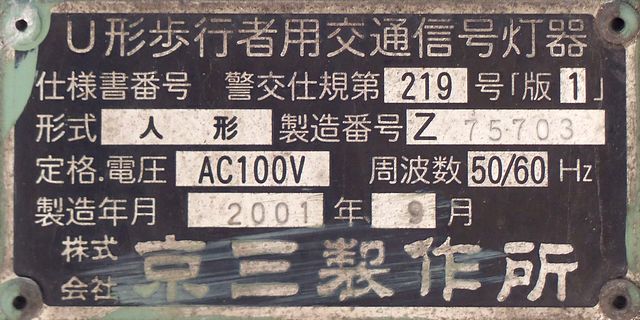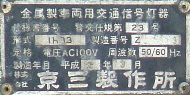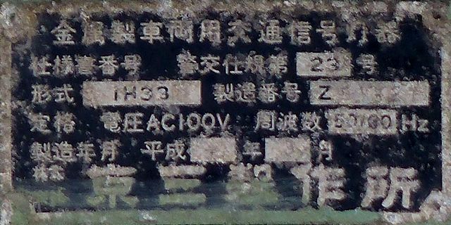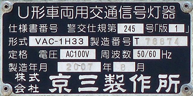 この位置にはもともと駅前広場の出口が接続する交差点があり、そのときに2方向の灯器を設置していたデザイン柱ですが、その後、交差点形状の変更により、灯器のみが撤去され、デザイン柱のみが何年も残っていました。さらにその後2015年6月ごろ、横断歩道に屋根を設置する工事を進める中で補助灯器が必要となり、このデザイン柱に仮設灯器として保管されていたデザイン灯器を設置したようです。 横断歩道の屋根が完成すると、屋根の側面に通常塗装のフラット型灯器が設置され、このデザイン灯器はデザイン柱ごと撤去されたため、ごく短い期間しか見られませんでした。 銘板を見ると名称は「U形車両用交通信号灯器」、形式は「VAC-1H33」で、通常この形式であれば京三製2002年型灯器です。2007年8月製造で、この時期であれば福井県内ではすでにLED式灯器が標準となっていました。2007年夏ごろといえば、ちょうど福井駅西口の道路関係(交差点形状の変更等)の工事が本格的に始まるころであり、工事に伴い仮設用としてデザイン灯器が必要になるため製造され、ほぼ使用されずに保管されていたものと思われます。