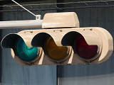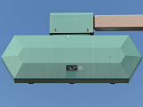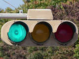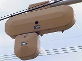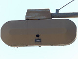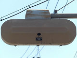 2交差点のみで見られるデザイン設置で、PC信号柱添架の1本アームで上部接続としています。灯器は通常の樹脂製灯器をベージュ塗装したものです。