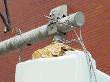 少し低い位置に設置されているため、歩道に乗り上げた車両に接触されてしまったようです。上部の接続部が破損したため、ガムテープを貼って針金で補強してあります。 |