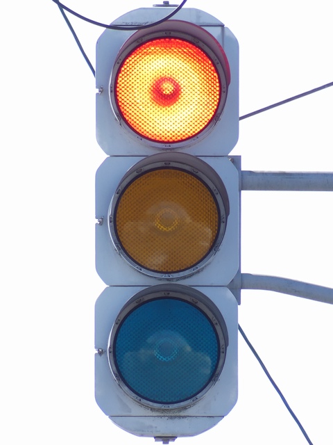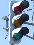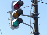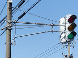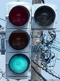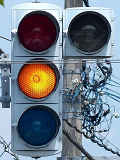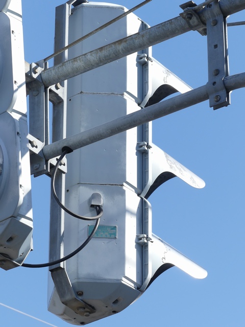 県内に1基しかないと思われる疑似点灯防止用のスフェリカルレンズ灯器です。この交差点の東進用主灯器のみがこの灯器となっていることから西日対策の試験設置と思われます。