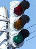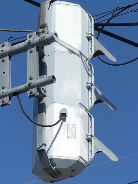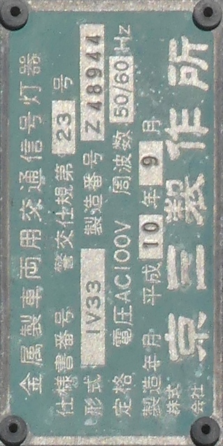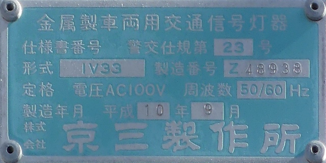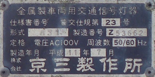 京三厚型分離型縦型灯器の銘板は通常横向きですが、県内では縦向きになっているものも見かけます。この交差点には製造年月が同じで製造番号の近いもので横向きのものも設置されています。