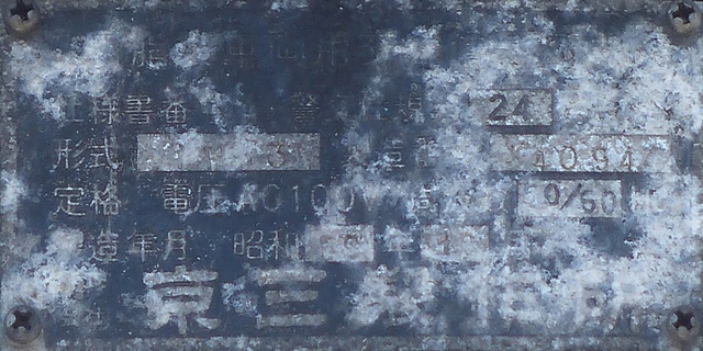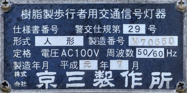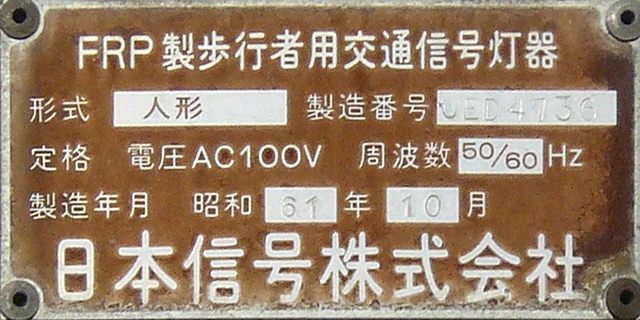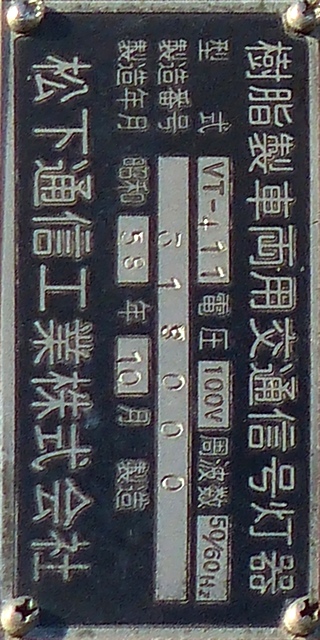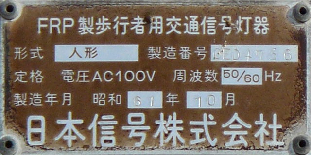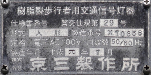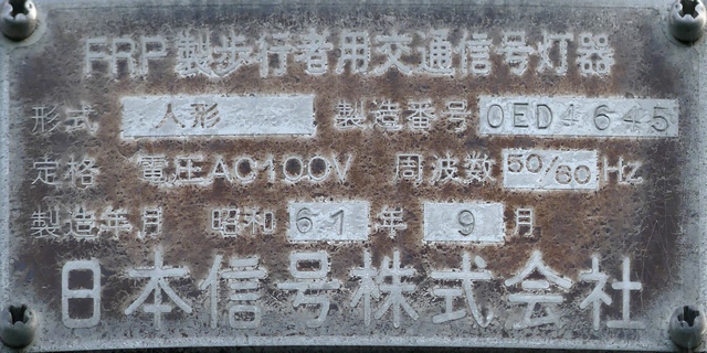 銘板に警交仕規の欄はありません。この交差点の灯器はすべて同じ製造番号が振られています。