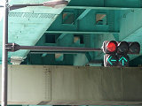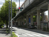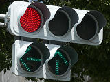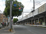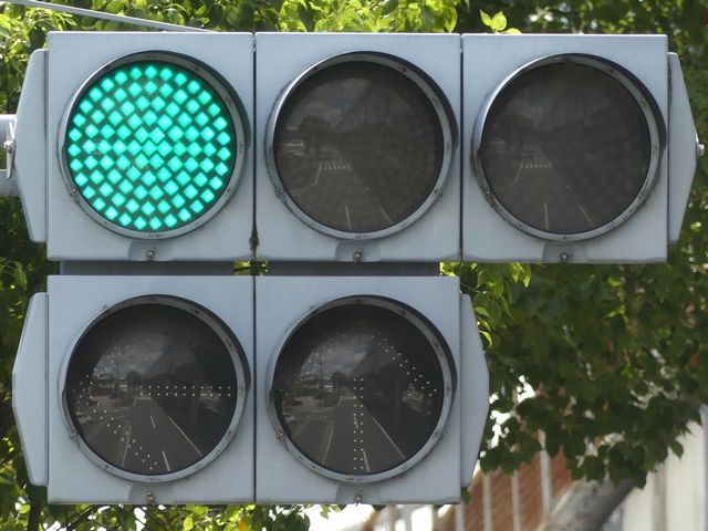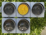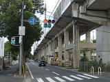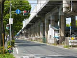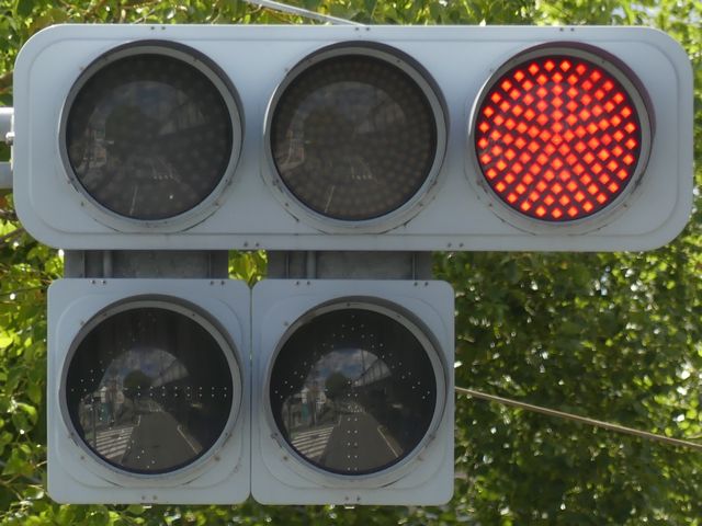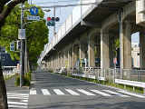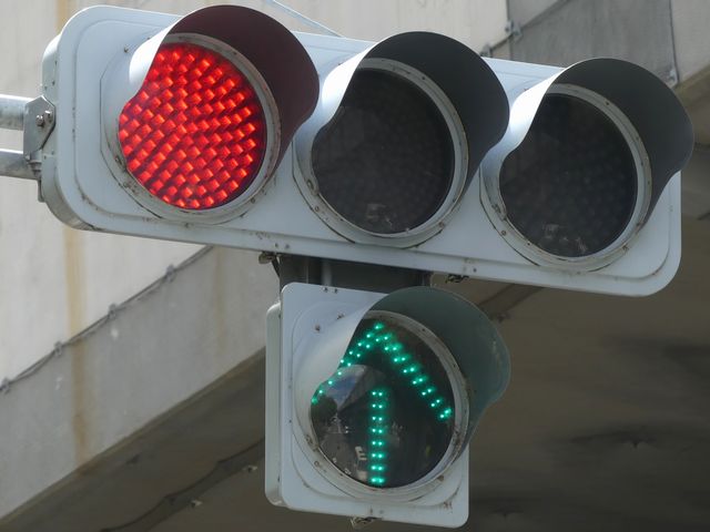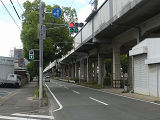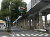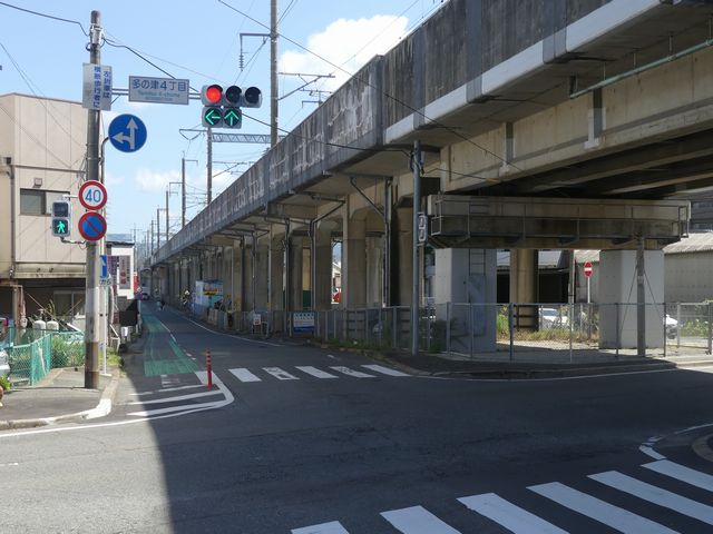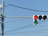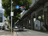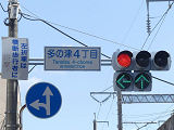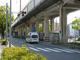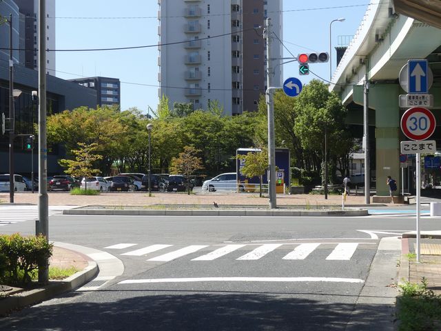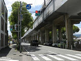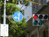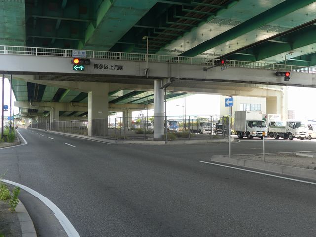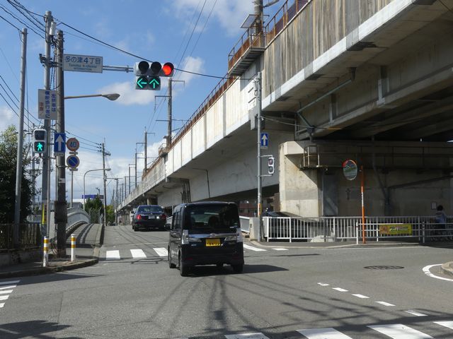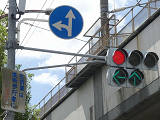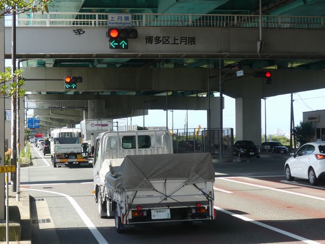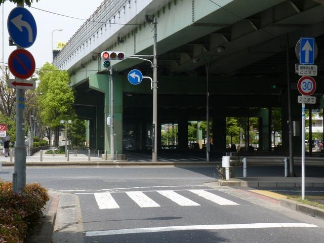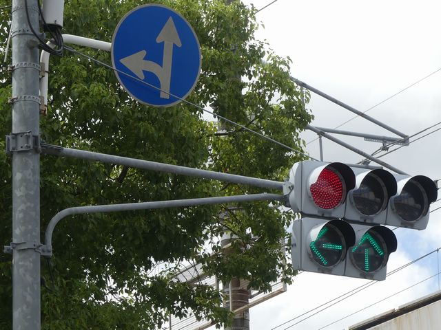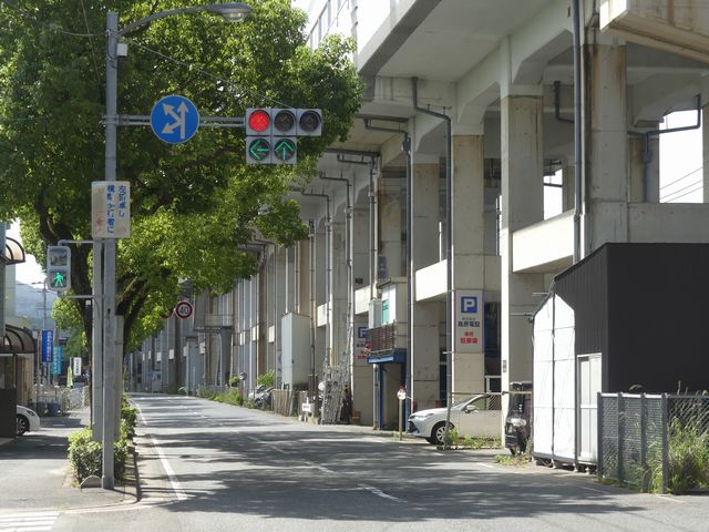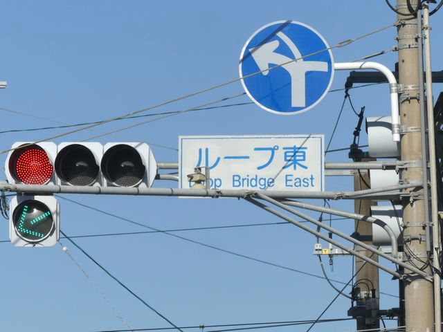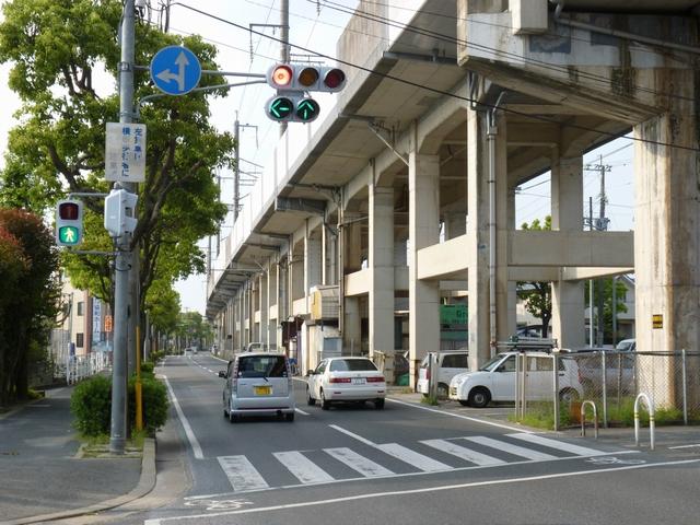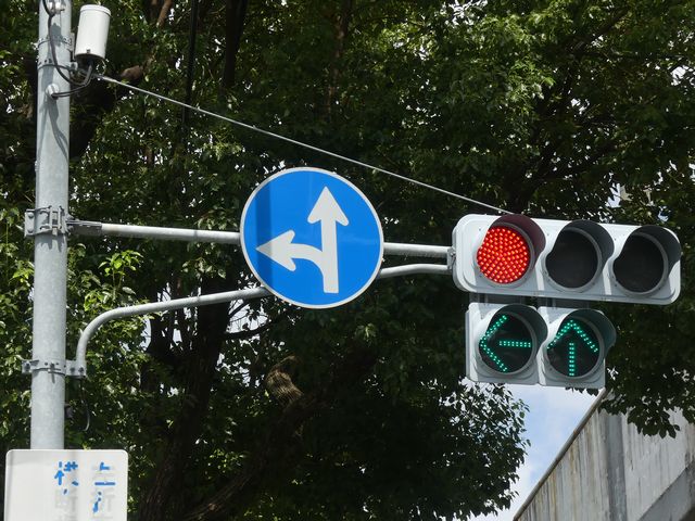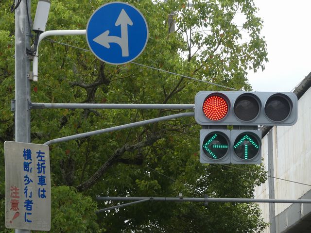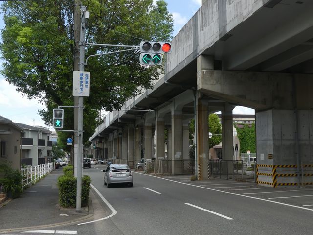 都市高速の高架下を並走する道路で上下線が分離され、また交通量が多いため、上下線とも右折車分離式信号となっています。右折車には別に信号があり、直進・左折車用信号は青信号にならず矢印信号で直進・左折のみ進行可としています。矢印点灯時に左赤が点灯し、赤からの信号の変わり目が分かりやすくなっています。