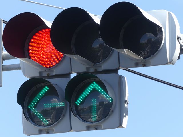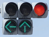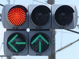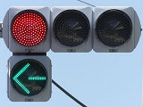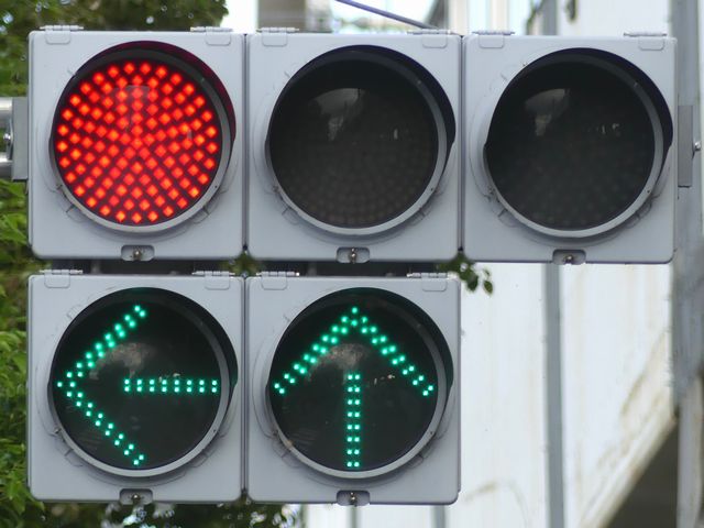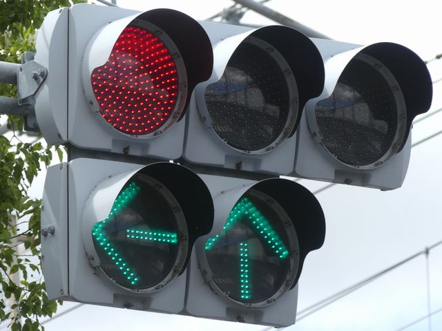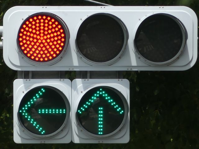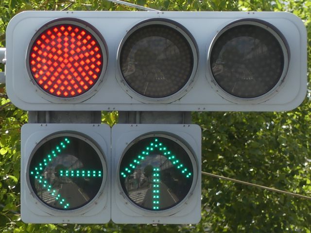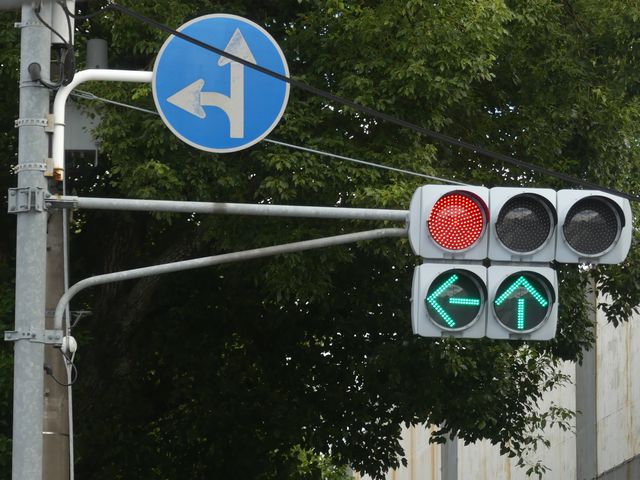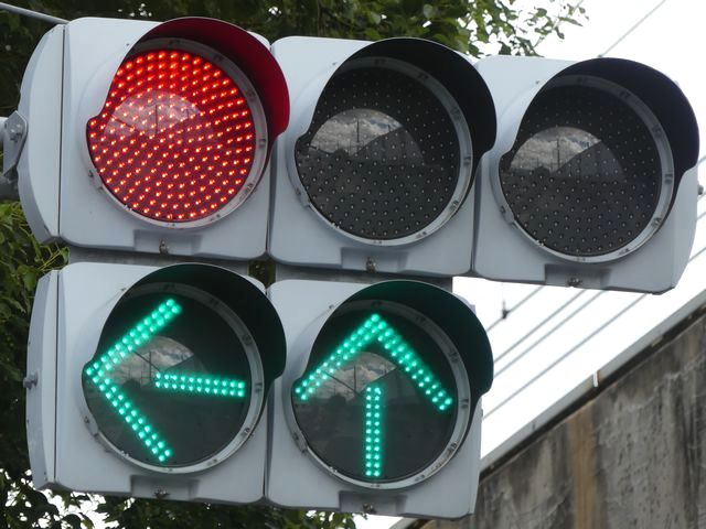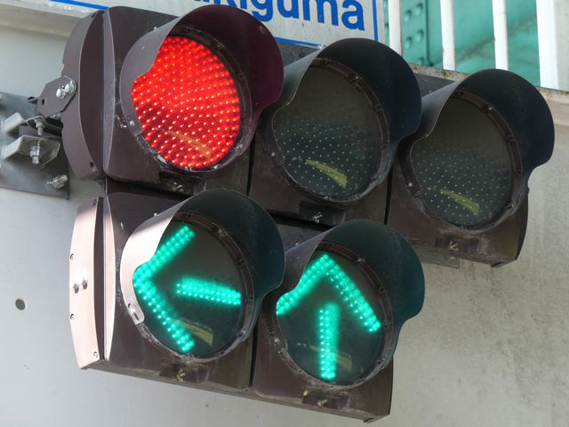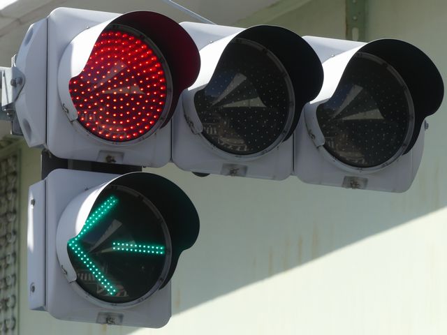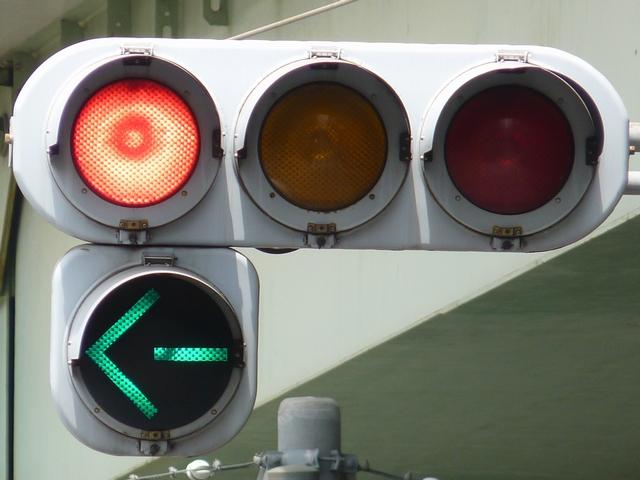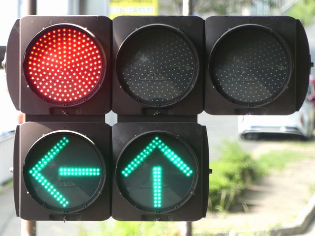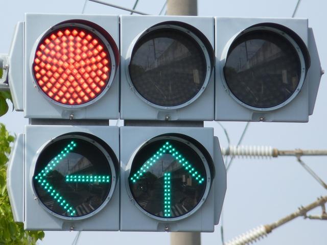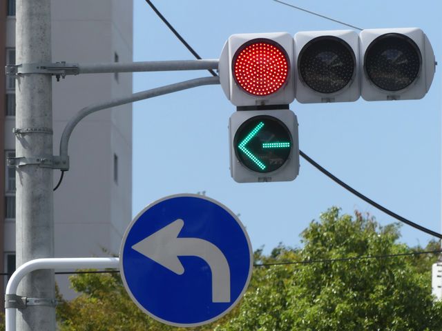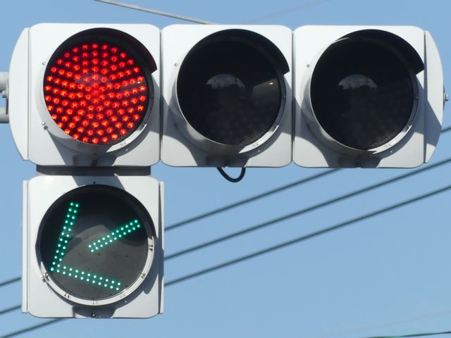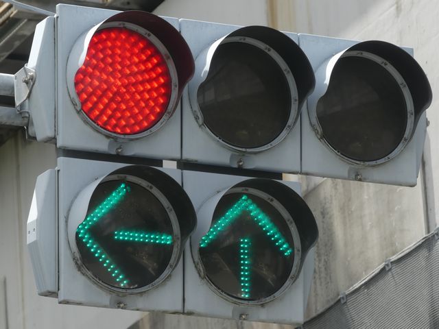 指定方向外進行禁止規制により直進・右折が禁止されており、誤進行防止のために、青信号にならず矢印信号で左折のみ進行可としています。矢印点灯時に左赤が点灯し、赤からの信号の変わり目が分かりやすくなっています。