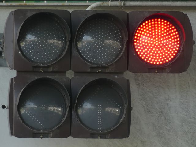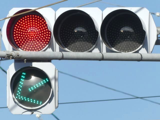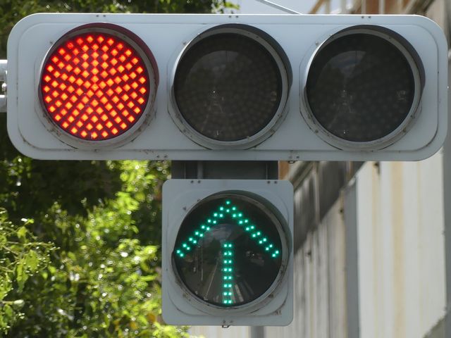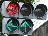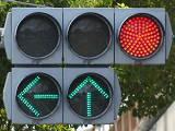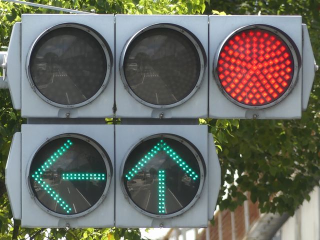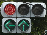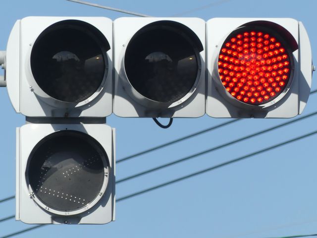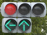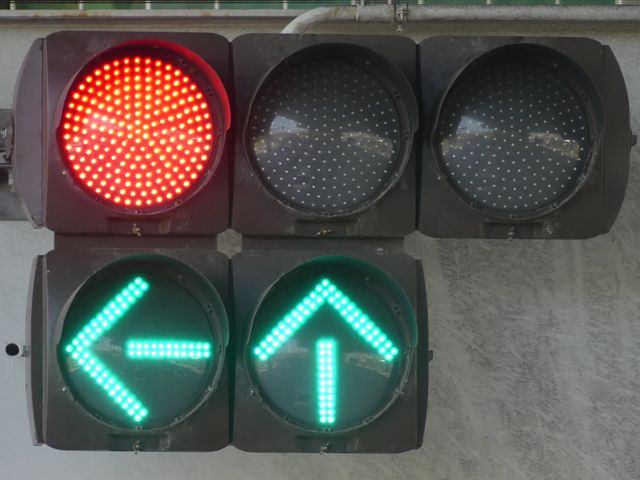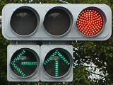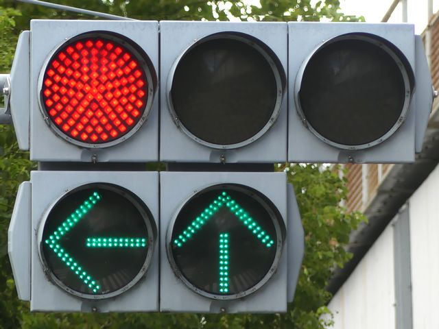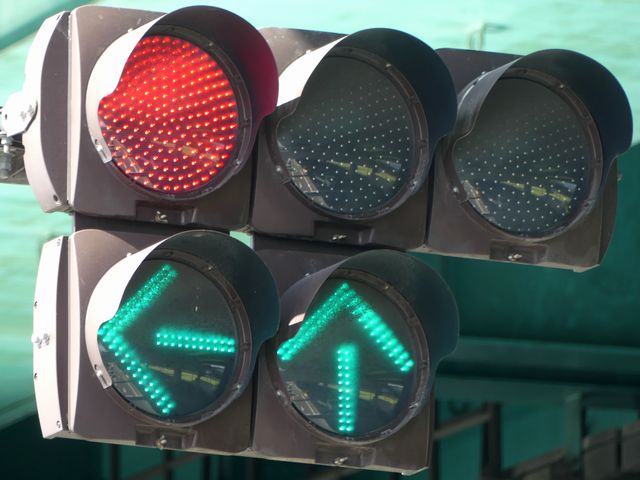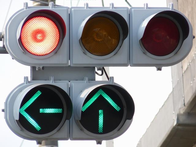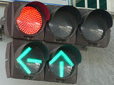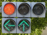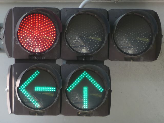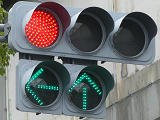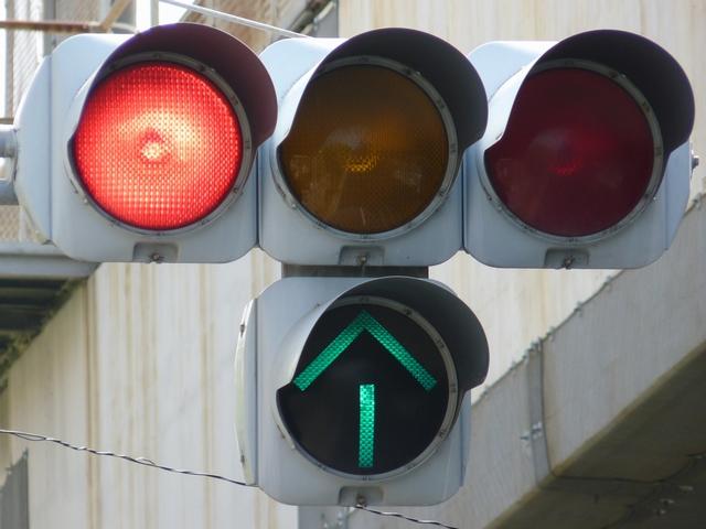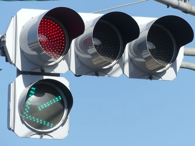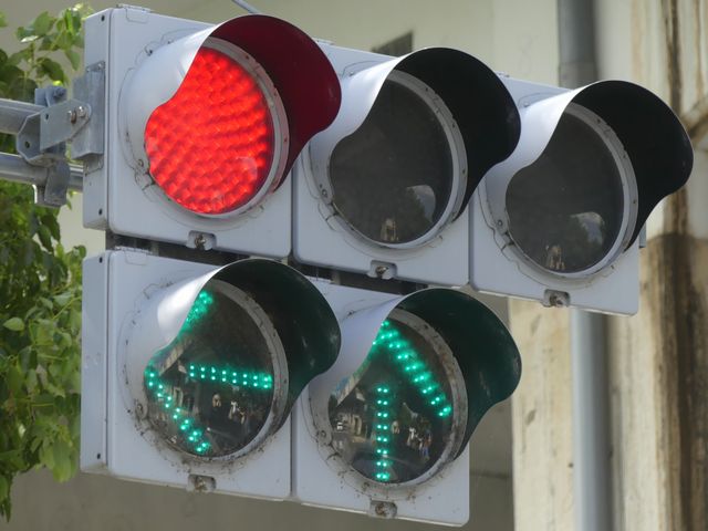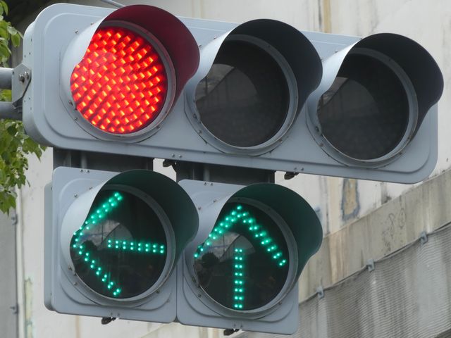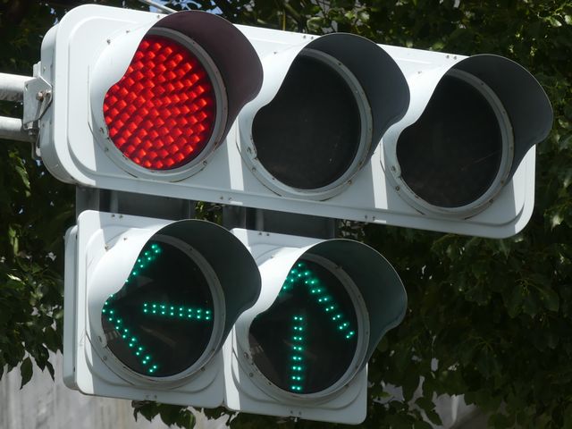 指定方向外進行禁止規制により直進・右折が禁止されており、誤進行防止のために、青信号にならず矢印信号で左折のみ進行可としています。矢印点灯時に左赤が点灯し、赤からの信号の変わり目が分かりやすくなっています。