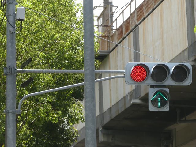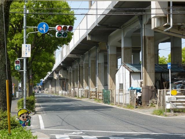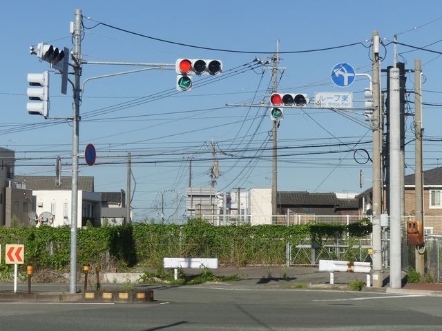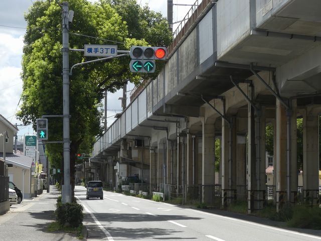 新幹線の高架下を並走する道路で上下線が分離され見通しが悪いため、指定方向外進行禁止規制により右折が禁止されており、誤進行防止のために、青信号にならず矢印信号で直進・左折のみ進行可としています。矢印点灯時に左赤が点灯し、赤からの信号の変わり目が分かりやすくなっています。