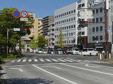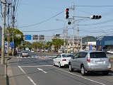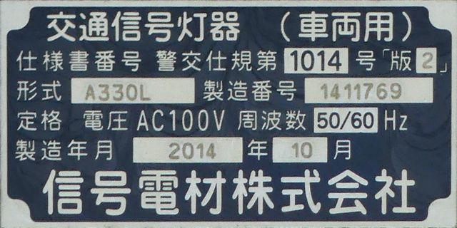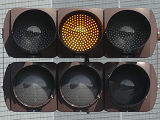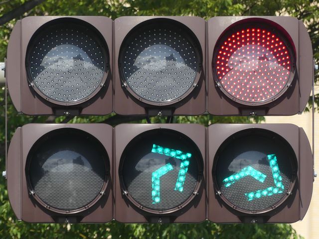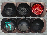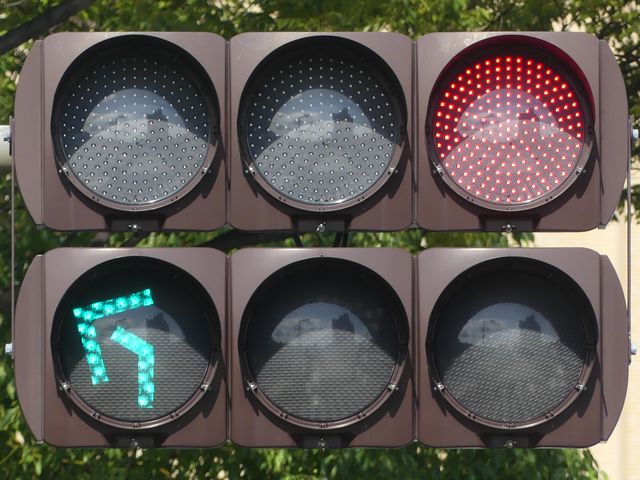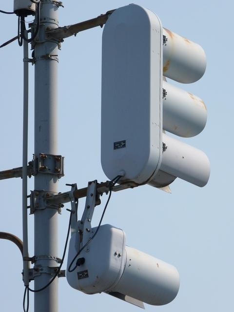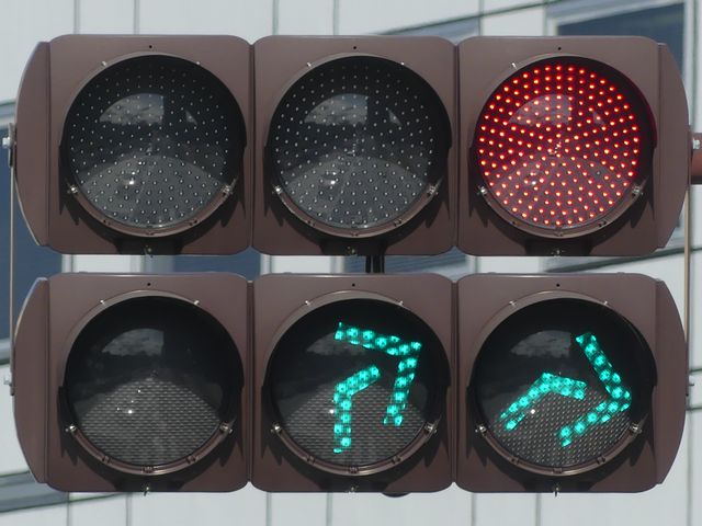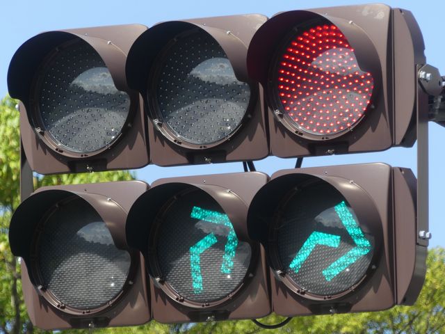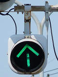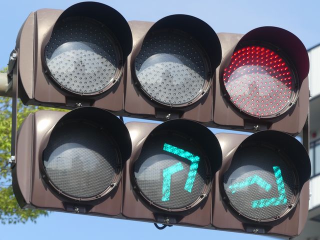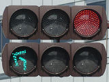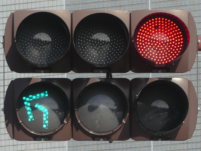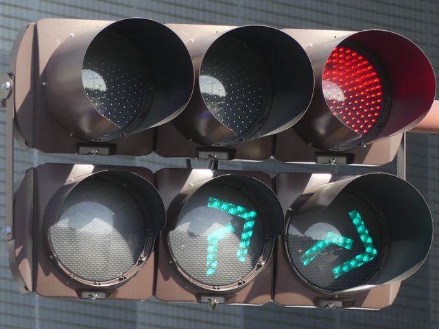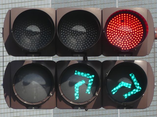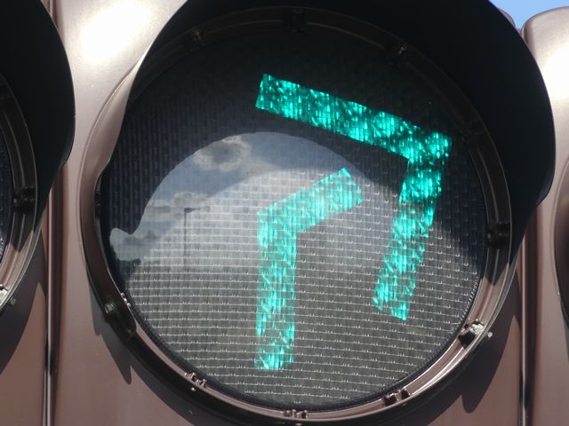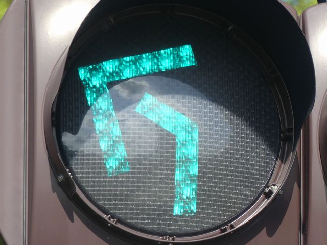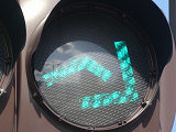 道路が斜めに交差する交差点で、いずれの進行方向も斜め方向となり通常の矢印信号ではわかりづらいためか、屈折した形状の矢印にしています。通常の矢印灯器ではLED素子を矢印の形に配列しますが、ここでは特殊な形状であるため、マスクで対応しています。
