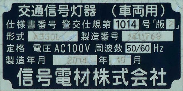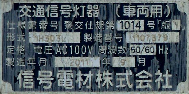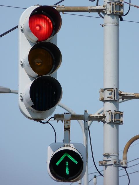 矢印灯器がアームから吊り下げられています。警察庁の通達では、縦型設置の場合、直進矢印は黄灯火の右側に配置するよう定められています。