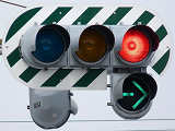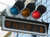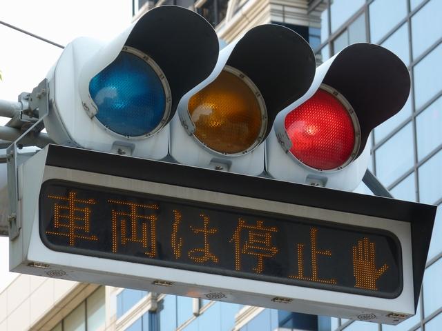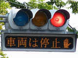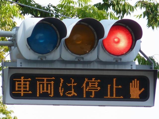 歩車分離信号で車両の見切り発進や、歩行者につられての発進を防止するために、赤信号のときに「車両は停止」の表示が点滅します。手(下が広がっているので手袋?)のイラストも表示されます。