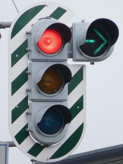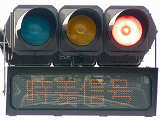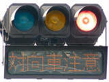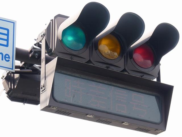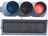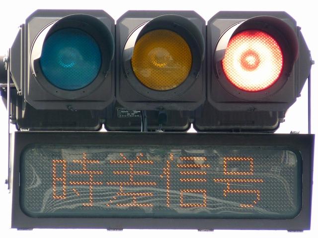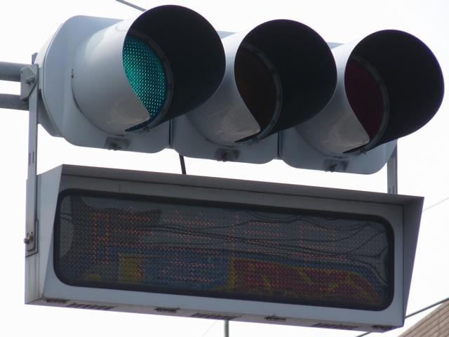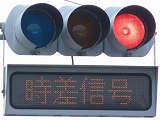 時差信号で、先に赤になる側が右折もできる場合に設置されています。通常は「時差信号」と表示されています。時差作動時に「対向車に注意」と「時差信号」の表示が交互に点灯し、すでに交差点内で右折待ちしている車両が「対向車も赤信号になった」と勘違いして対向車と衝突しないよう注意喚起します。